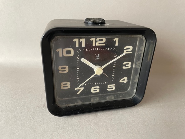 CENDRIC , réveil de la gamme Jaz Quartz , à sonnerie progressive à répétition , silencieux , mouvement électrique , à pile LR 14 . Nouveauté du catalogue 1982-83 à la page 11. Boîtier en plastique , aiguilles et chiffres lumineux , trotteuse centrale , arrêt de sonnerie au sommet , Made in Japan .
