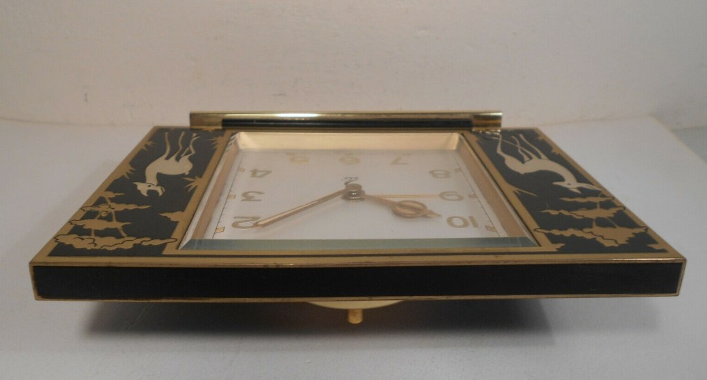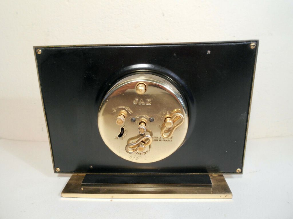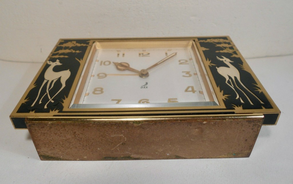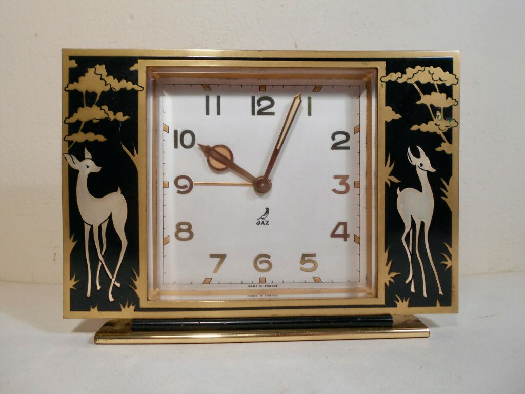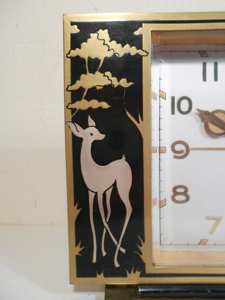 BAMBIC , réveil , gamme des Stylites , mouvement mécanique , calibre 1J . Présent au tarif d’Oct. 1951 page 4 , référencée 392-11 . Boîtier en métal laqué ivoire , décor de faons , cadran métal argenté , chiffres et points d’heures en relief et dorés , socle terrasse en métal doré , aiguilles et points lumineux .Format 14,5 x 10,5 cm , 550 gr.