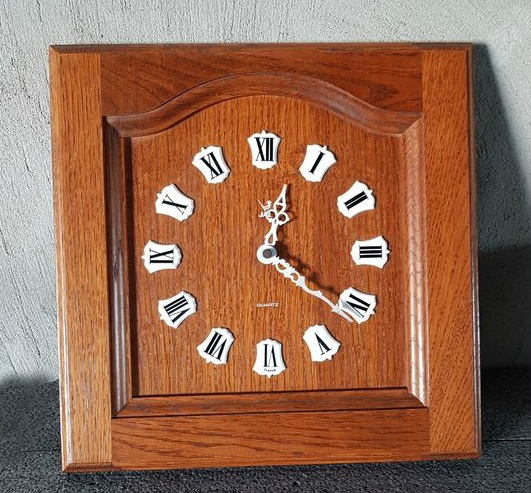 CUISIC , horloge murale , gamme Jaz Quartz , mouvement à quartz , pile LR6 , calibre MAK . Nouveauté du catalogue 1982-83 à la page 16 , référencée 7105-10 . Forme porte de placard de cuisine en chêne à l’origine de son nom , chiffres romains sur écoinçons blancs , aiguilles blanches , pas de trotteuse . Format 30 x 30 cm .