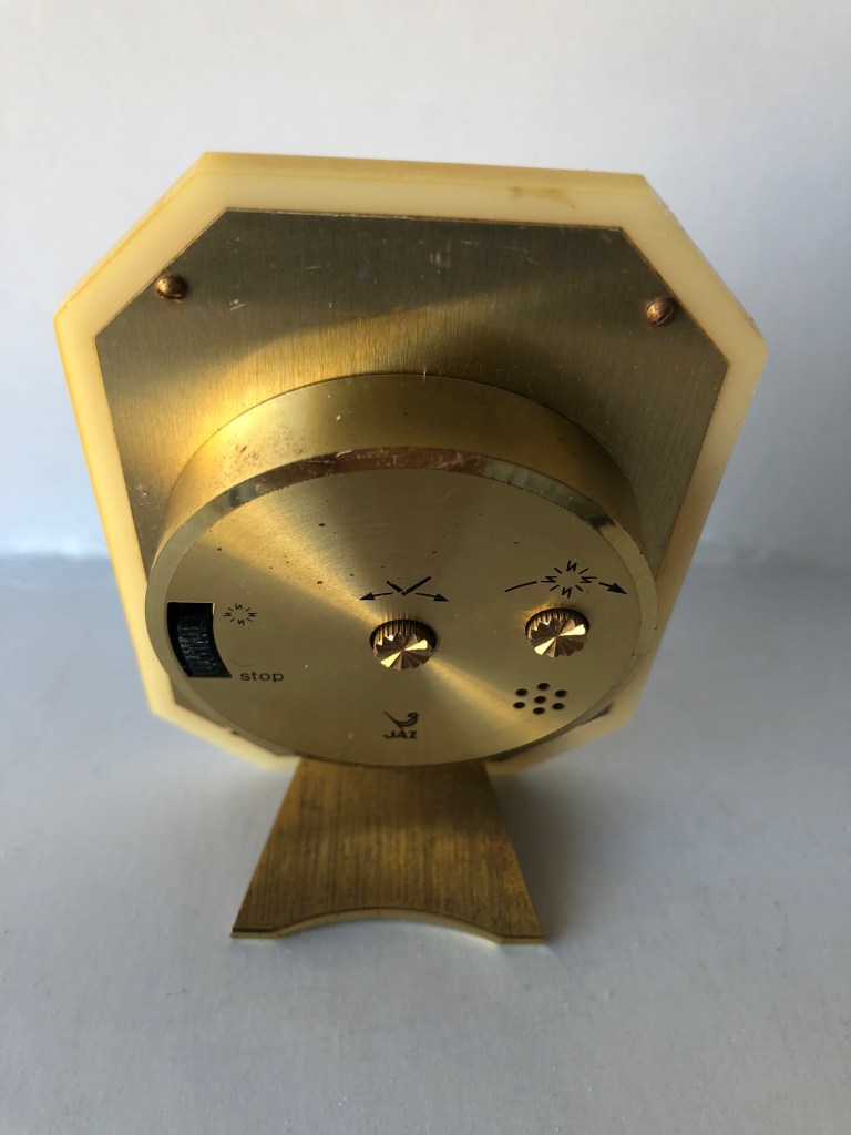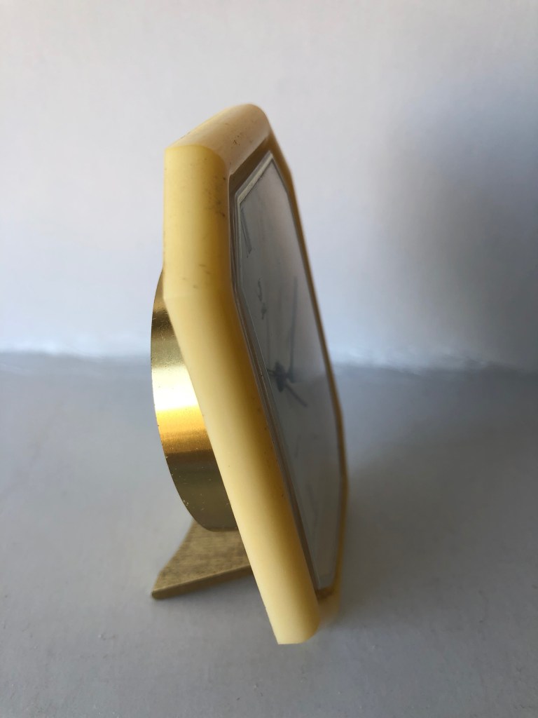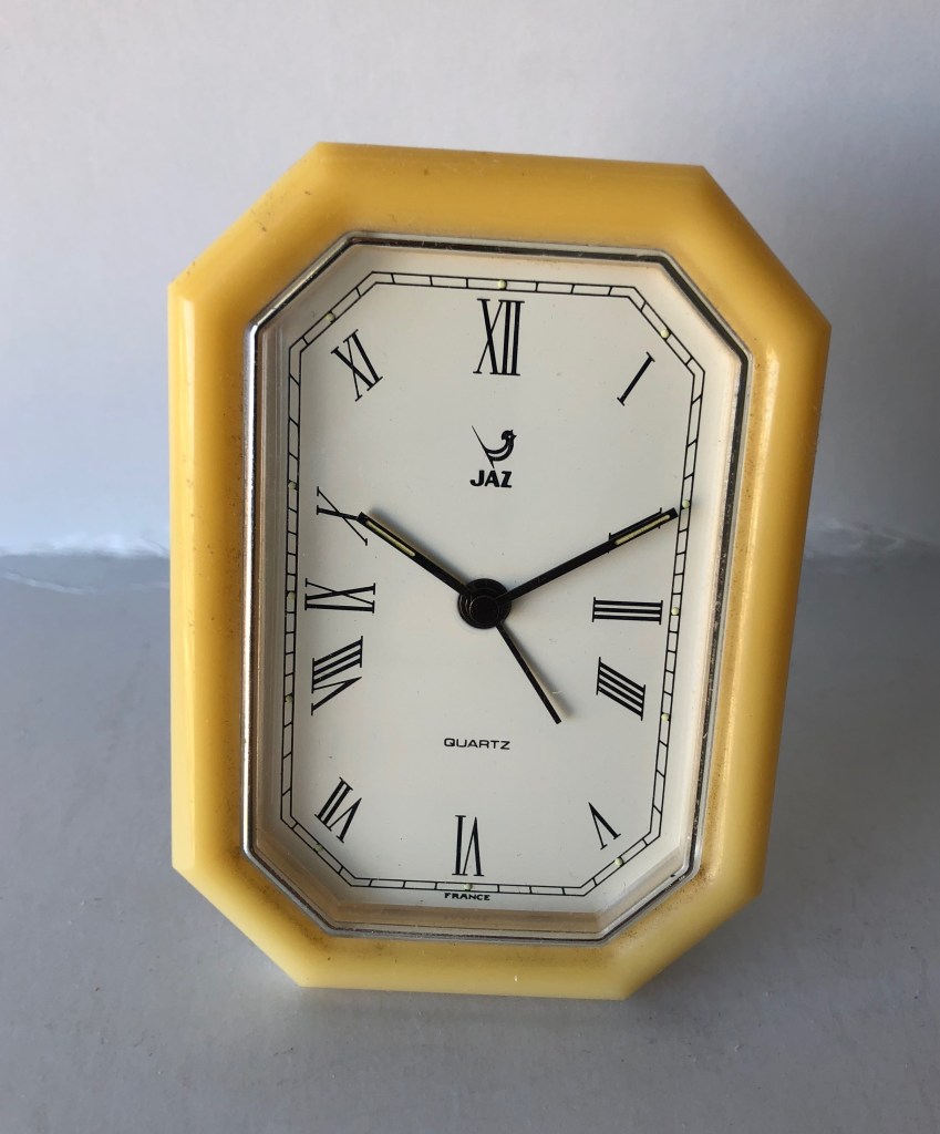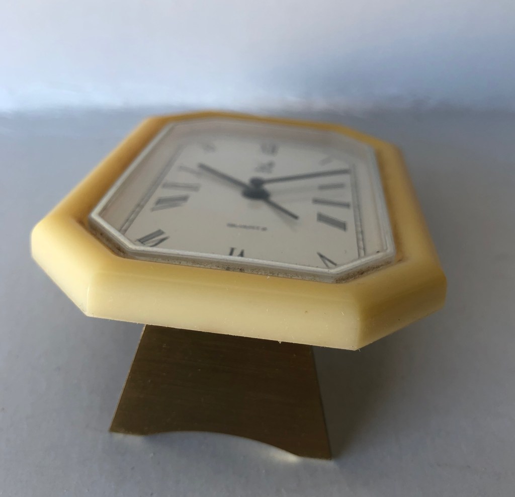 TERCIC , petit réveil , gamme Jaz Quartz , mouvement à pile bouton SR44 , calibre RQK mouvement extra-plat . Nouveauté du catalogue 1982-83 à la page 2 . Boîtier octogonal , chevalet , chiffres romains , chemin de fer octogonal au pourtour du cadran , aiguilles bâtons noirs , aiguilles et points lumineux. Format 6,4 x 8,9 cm . Le TERCIC est disponible en bordeaux réf. 8085-41 ou ivoire réf. 8085-11 .