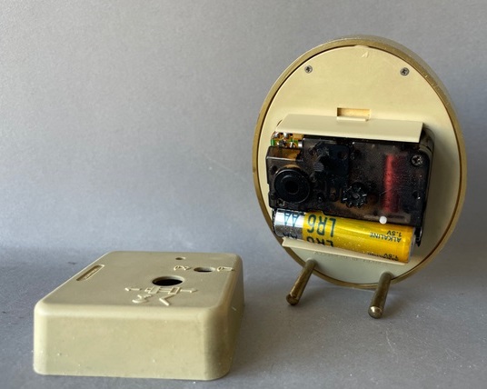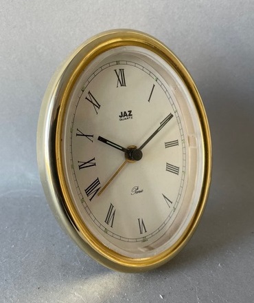 LAVIC , petit réveil de la gamme Jaz Quartz et Jaz Paris , à sonnerie par moduleur buzzer , silencieux , mouvement à pile LR6 , calibre RQK . Nouveauté du catalogue 1982/83 à la page 4 , référencée 8118-11 . Boîtier plastique doré, chiffres romains ,chemin de fer ovale au pourtour du cadran, aiguilles noires, aiguilles et points lumineux . Format 7,5 x 9,7 x 3 cm .