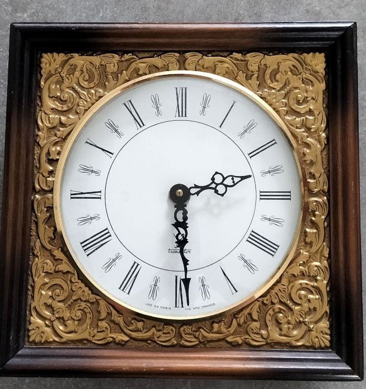 ORIC , horloge murale , gamme des Jaz Transistor , mouvement à pile LR14 , calibre AN , licence ATO . Nouveauté du catalogue 1969/70 à la page 24 , référencée 2260-10 . Plaque en métal doré brillant à décor en relief et cadre en véritable chêne teinté , chiffres romains . Format 22,5 x 22,5 cm . La dénomination ORIC sera réattribuée en 1978 à un petit réveil doté lui aussi d’un décor « or ».