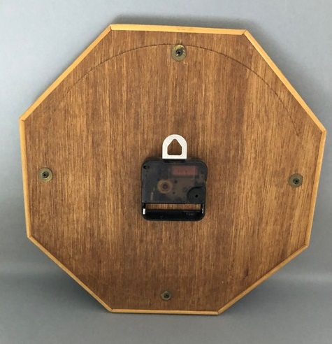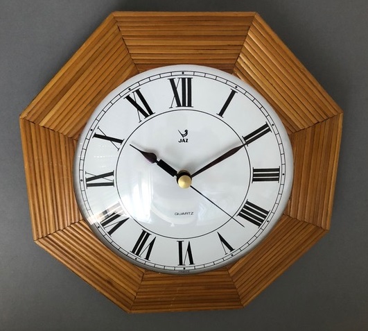 SURIC , horloge murale octogonale, corps en bois décor de paille , mouvement à Quartz , pile LR6 , calibre MAK . Nouveauté du catalogue 1982-83 à la page 15 réf: 711-10 ., cadran blanc métal émaillé , chiffres romains ,aiguilles poire et feuille noires, chemin de fer au pourtour du cadran, trotteuse centrale . Format 26 x 26 cm . Elle n’est plus disponible en 1984.