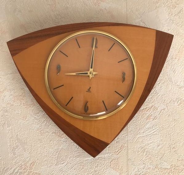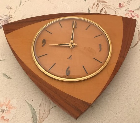 CORVIC , horloge murale , Jaz Transistor , mouvement électrique à pile , calibre 4AN , licence ATO . Nouveauté du catalogue 196 /67 à la page 15 , référencée 2238-10 . Boîtier plaqué bois véritable , sycomore et noyer façon ébénisterie , lunette en métal doré , vitre en verre bombé , jonc doré au pourtour , chiffres en relief et index noirs , aiguilles dauphines , aiguilles dorées et noires , pas de trotteuse . Format 32 x 25 cm .