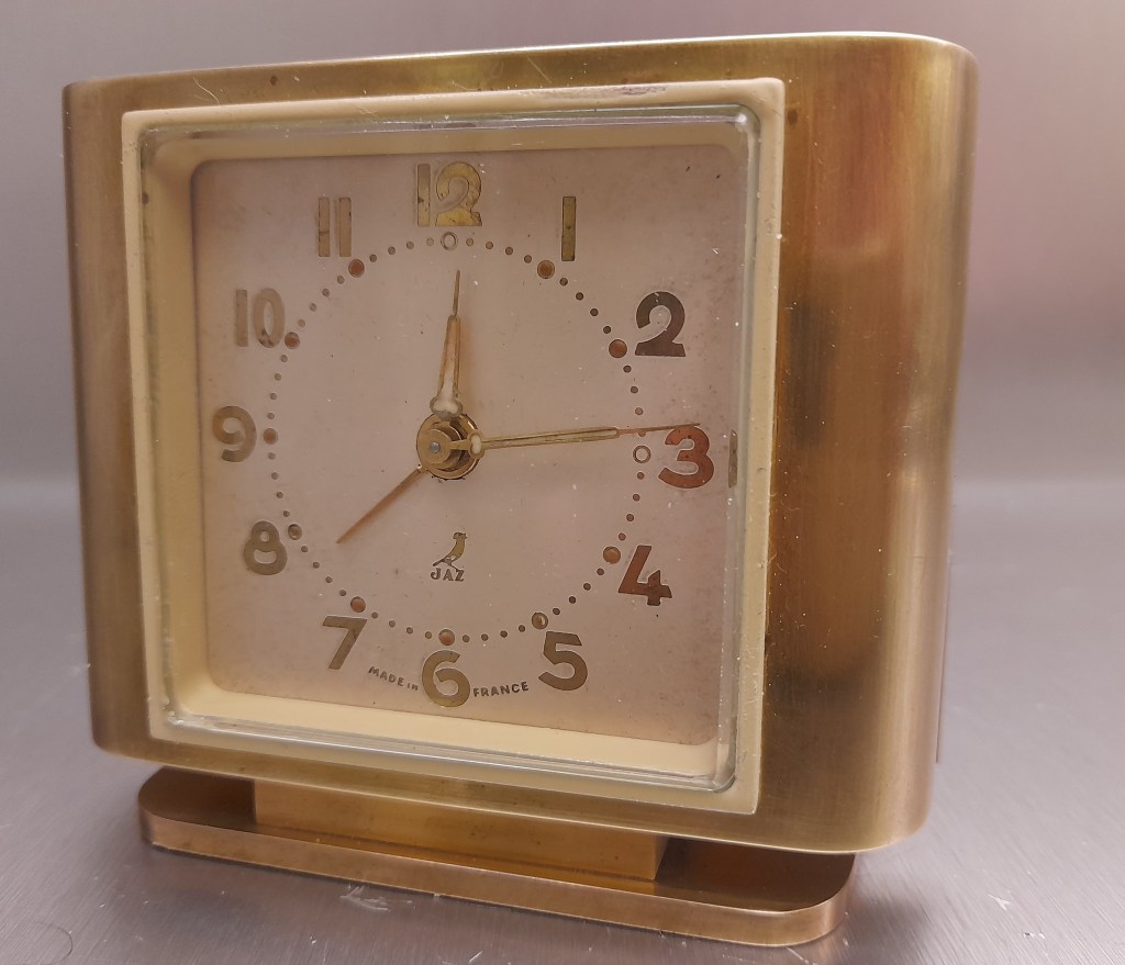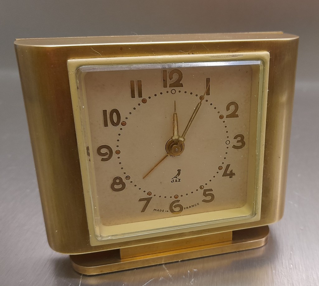 DABRIC , petit réveil , gamme des Stylites , mouvement mécanique , calibre J. Nouveauté du catalogue 1952 , référencé 380-11 . Boîtier et socle en métal doré , lunette en métal , vitre en verre biseauté , cadran métal , aiguilles et points lumineux , aiguilles phalliques . Format 10 x 9 cm , poids 390 gr. Le DABRIC est identique au CABRIC hormis son cadran et son socle qui sont plus conventionnels .