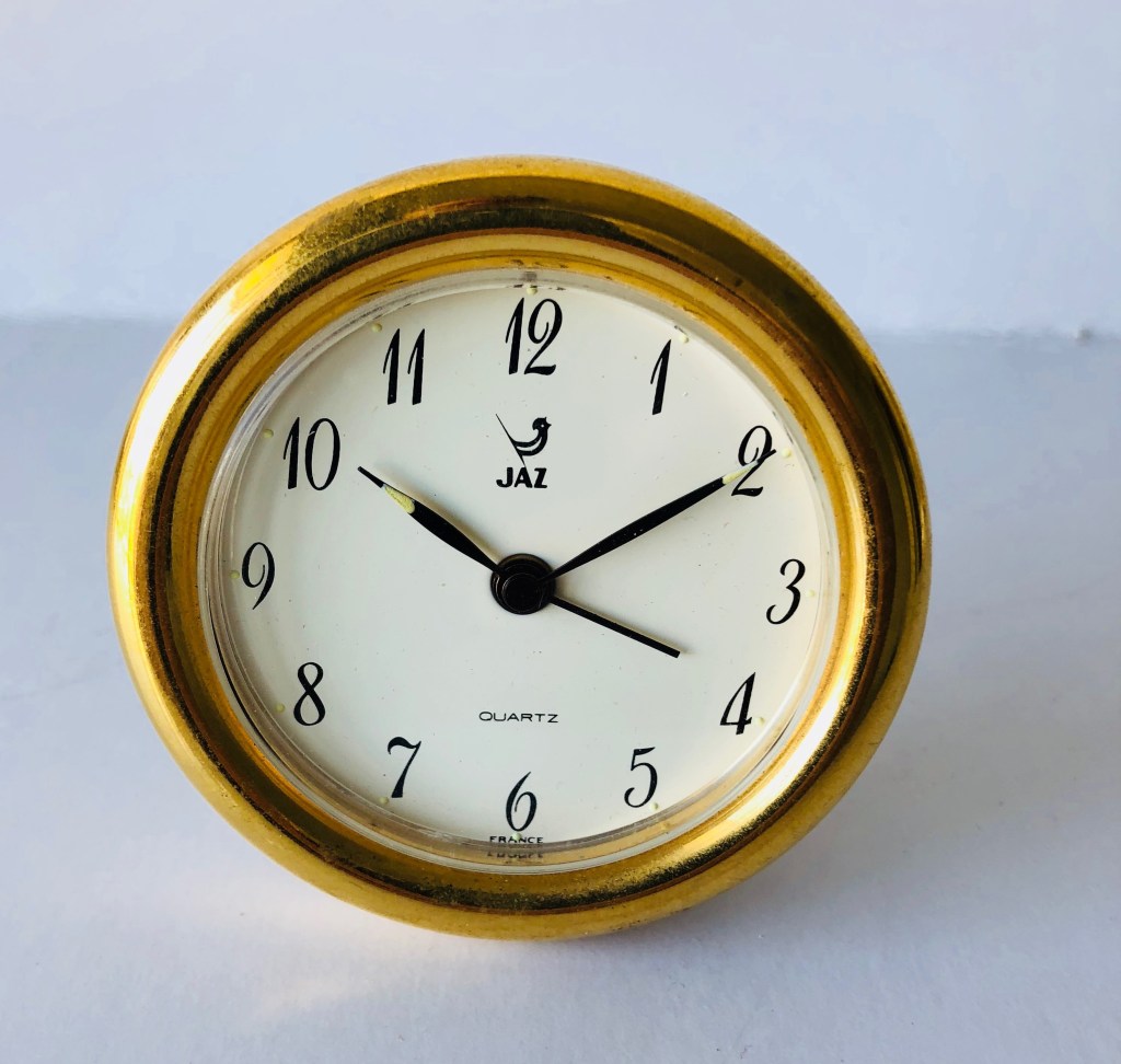 RODIC , réveil de la gamme Jaz Quartz , mouvement électrique à pile bouton LR44 . Nouveauté du catalogue 1983 , référencée 8076-71 . Boîtier rond en métal couleur dorée , cadran blanc , chiffres Breguet , aiguilles feuilles noires , aiguilles et points lumineux , mention France en bas de cadran . Diamètre 6,9 cm .