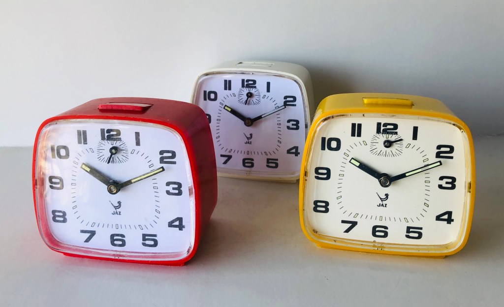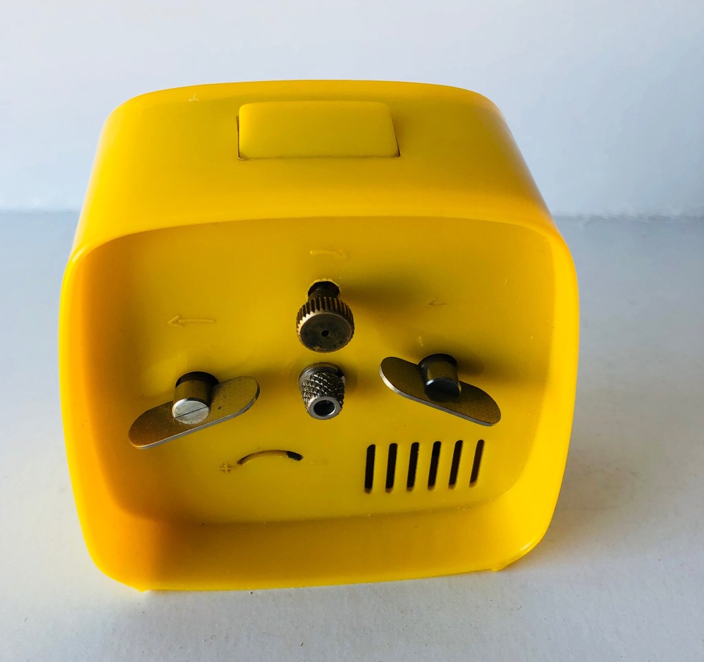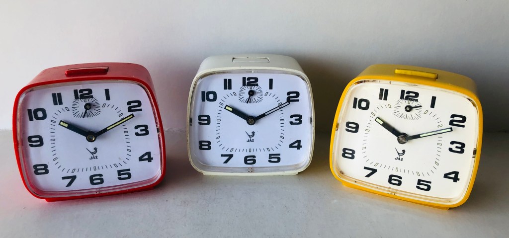 Disponible uniquement dans les catalogues Jaz Export 1976 et 1977 référencé 1218-11 pour le modèle blanc , 1218-61 pour le rouge et 1218-71 pour le modèle jaune . Aiguilles et points lumineux , arrêt de sonnerie au sommet .