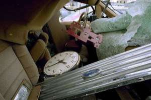 Une horloge, qui s’est produite l’heure de l’explosion au World Trade Center, se trouve dans l’épave d’un véhicule sur un terrain de Brooklyn, le 9 mars 1993.