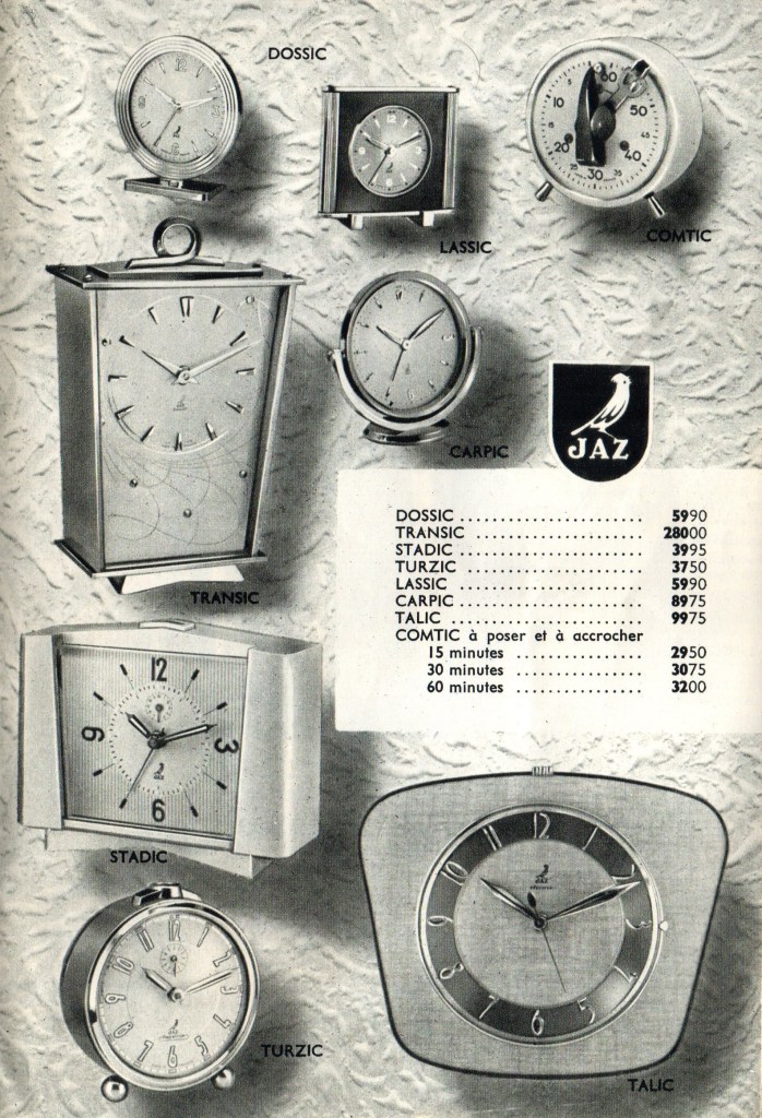 Il est intéressant de constater que la TALIC de Jaz est un peu moins cher que la Vedette 7/468 à pile, tout a fait similaire: la trotteuse en moins! Jaz proposait à la même date deux horloges suspendues à un cordon, les TRINIC et PENDIC, très semblable à la Vedette 7/389.