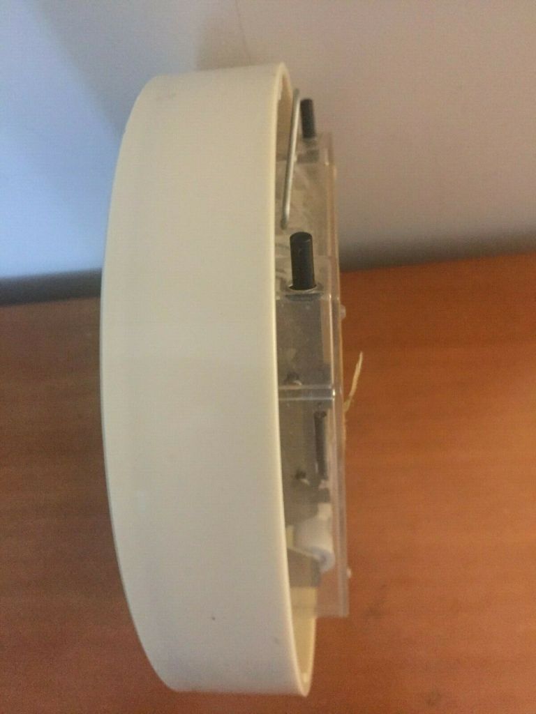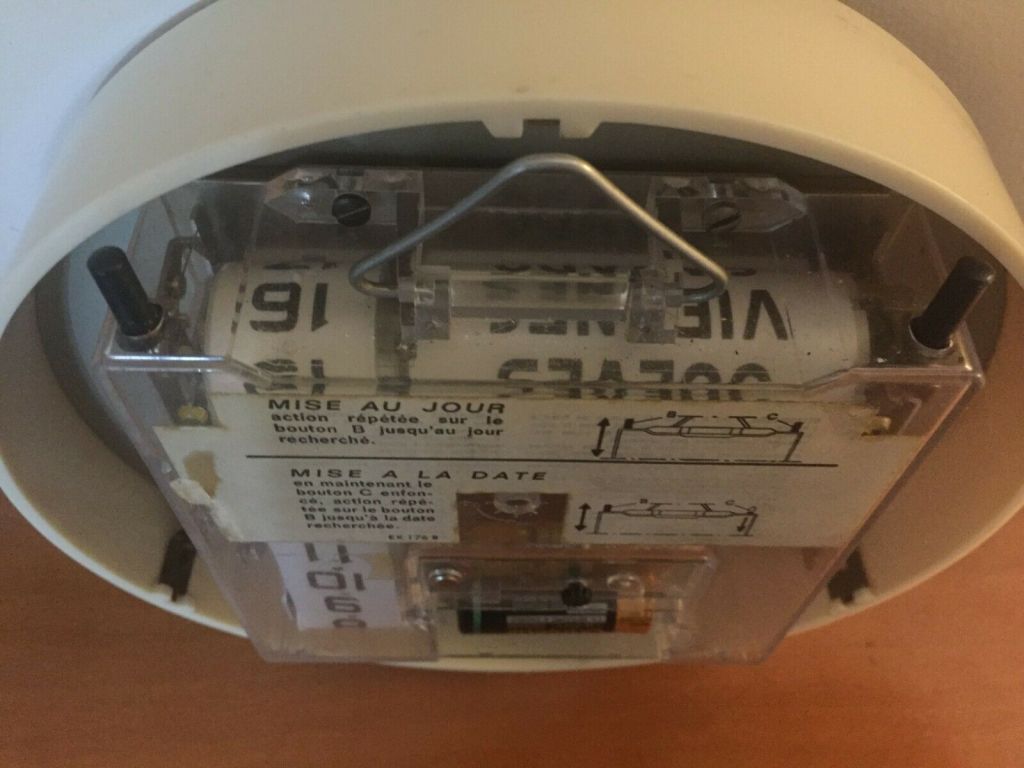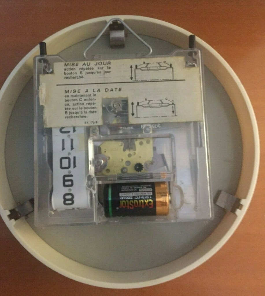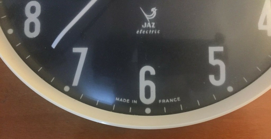 Jaz Electric , horloge murale , forme ronde , calibre JK à pile LR14 , dateur à date et jour corps en plastique , Made in France . Hors catalogue France , disponible uniquement à l’export en Espagne .