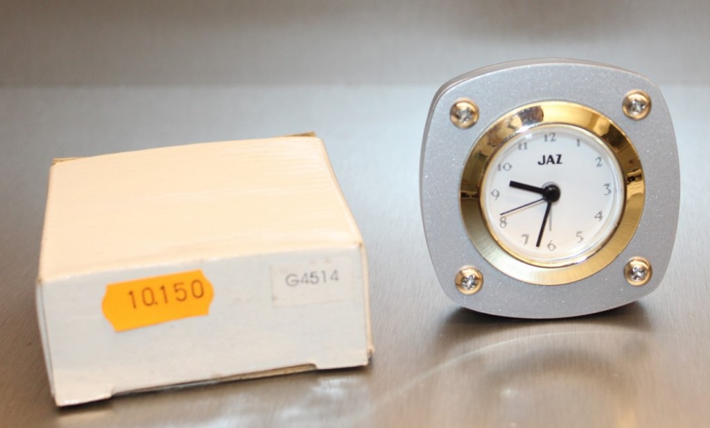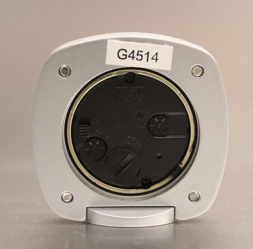G4514 très petit réveil , corps tout en métal , cadran blanc rond , lunette dorée , vitre très légèrement bombée en acrylique , à quartz , à pile bouton AG13 ou LR44 , quatre vis cruciformes aux angles , trotteuse centrale noire , aiguilles noires non lumineuses , 6,5 x 6,5 cm , poids sans la pile 140 gr, circa 1999. Made in China . voir un réveil de la même gamme , très similaire.