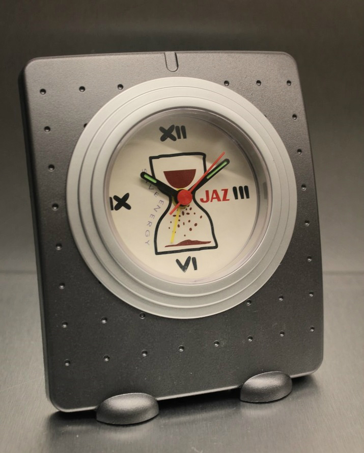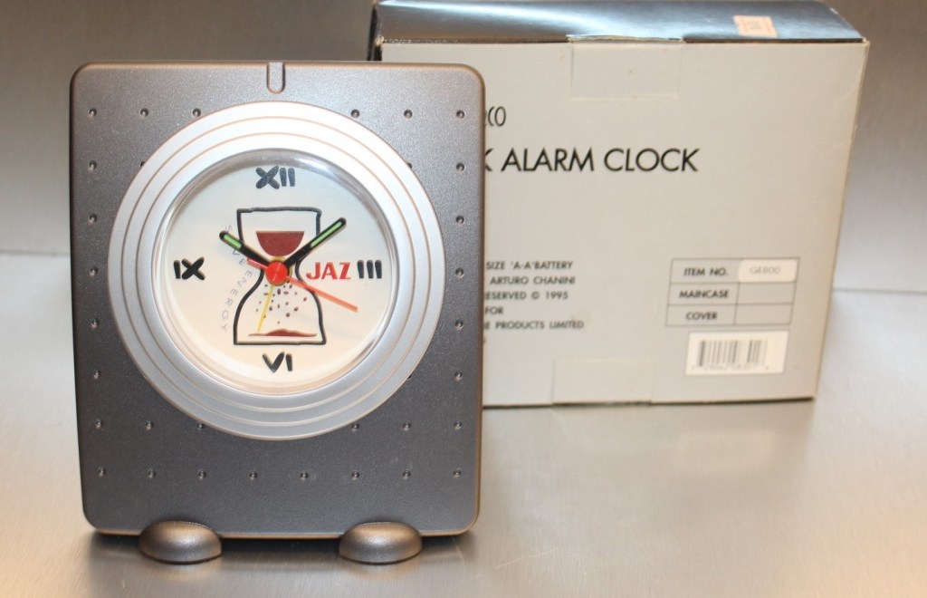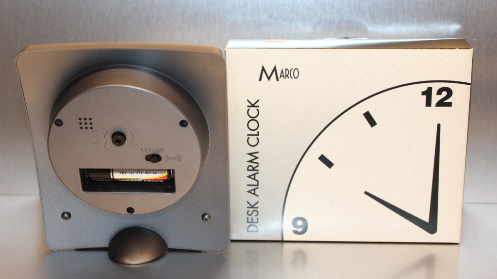 Docteur GLUBE, réveil, corps en plastique, nouveauté du catalogue 1997/1998 page 19, version grise référencée G4800, quatre chiffres romains cardinaux , aiguilles lumineuses, à pile LR6, trotteuse centrale rouge, format 14,6 x 12 x 6 cm, poids 150 gr sans la pile. La trappe de pile n’est pas absente , ces modèles Docteur GLUBE n’en comportaient pas . Marco Home Products Limited est une entreprise hongkongaise, fondée en 1990, qui produit des produits de maison de haute qualité avec un design contemporain: des ustensiles de cuisine aux minuteurs. Le design de ce réveil est attribué à Arturo Chanini qui semble être une entité fictive recouvrant un bureau de stylisme. Voir la version dorée ou bleue marine .