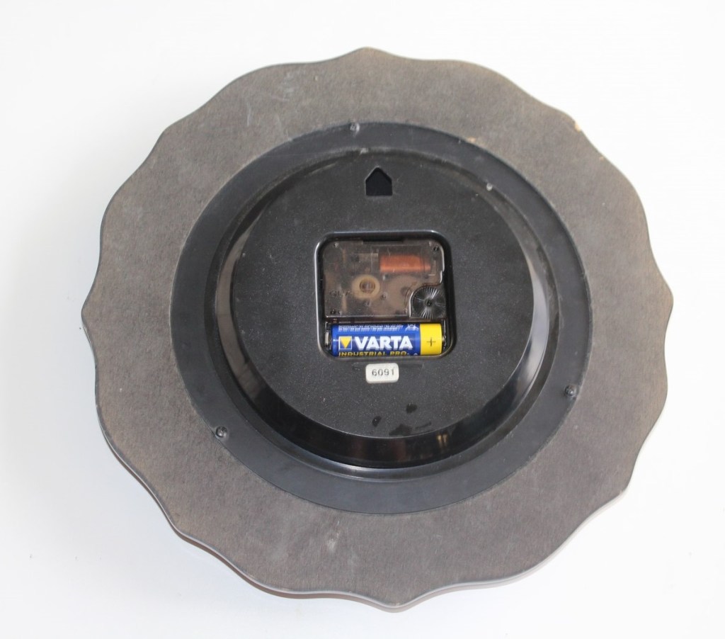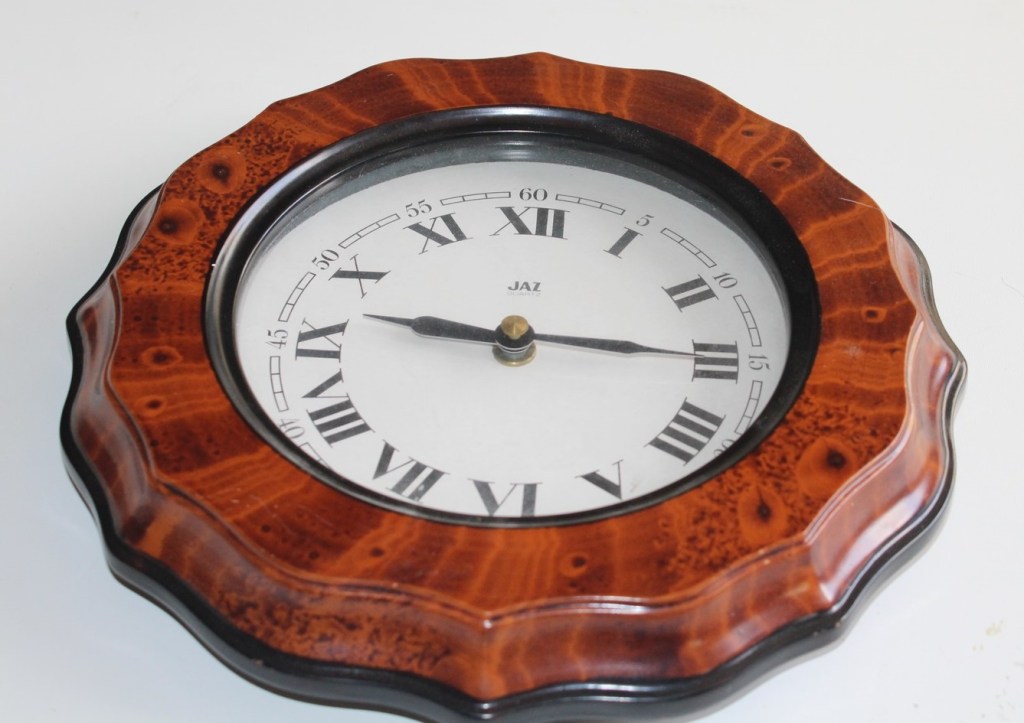 6091 , horloge murale , gamme Jaz Quartz , aiguilles noires seringues , chiffres romains , calibre MAK caréné , bois finition ronce de noyer ( il s’agit de bois compressé reconstitué et d’une peinture façon loupe d’orme différente à chaque pendule ) nouveauté du catalogue 1988/1989 page 27 , pile LR6 , diamètre 26 cm , poids 780 gr dans la pile , chiffres romains sur cadran blanc , chemin de fer allégé numéroté jusqu’à 60 , vitre en verre plat .