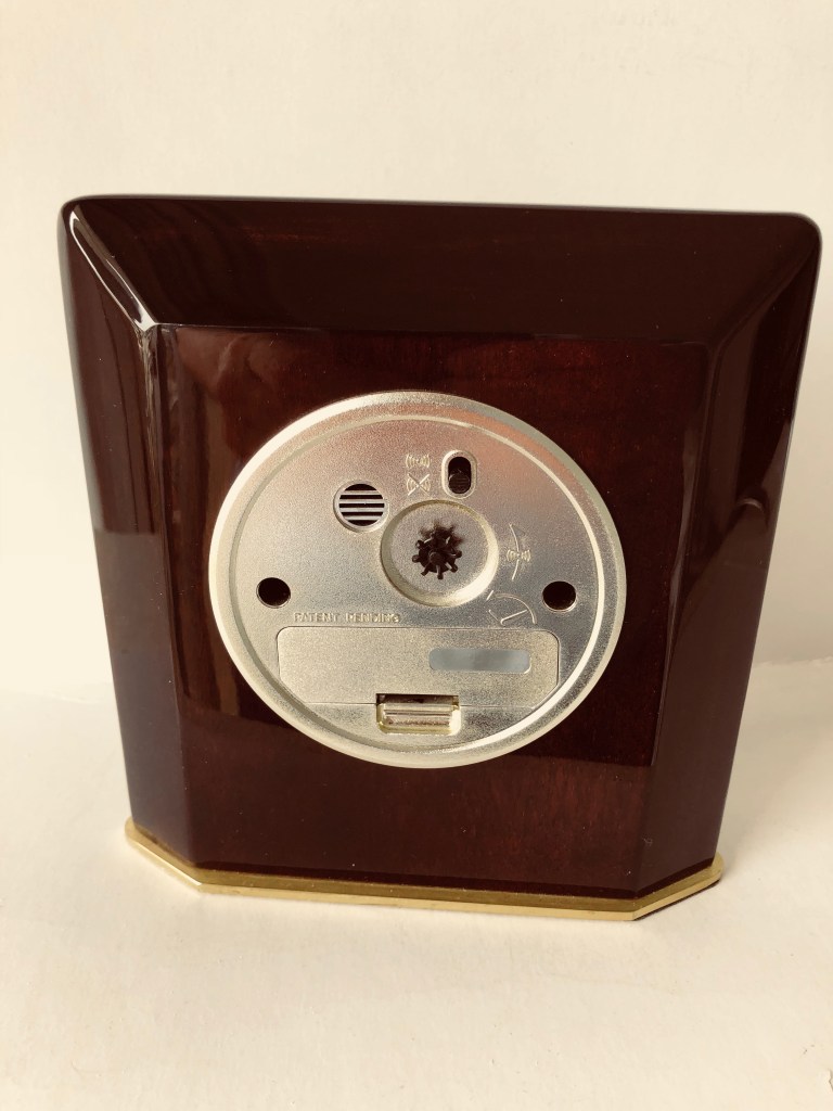 G5231 , réveil gamme Jaz Quartz , corps en bois acajou , lunette en laiton doré , pile LR6 , aiguilles noires poire et feuille , chemin de fer rond à l’extérieur de la zone des chiffres , présent uniquement au catalogue 1997/1998 page 4 , trotteuse centrale dorée , format 13,5 x 13,4 x 3,7 cm