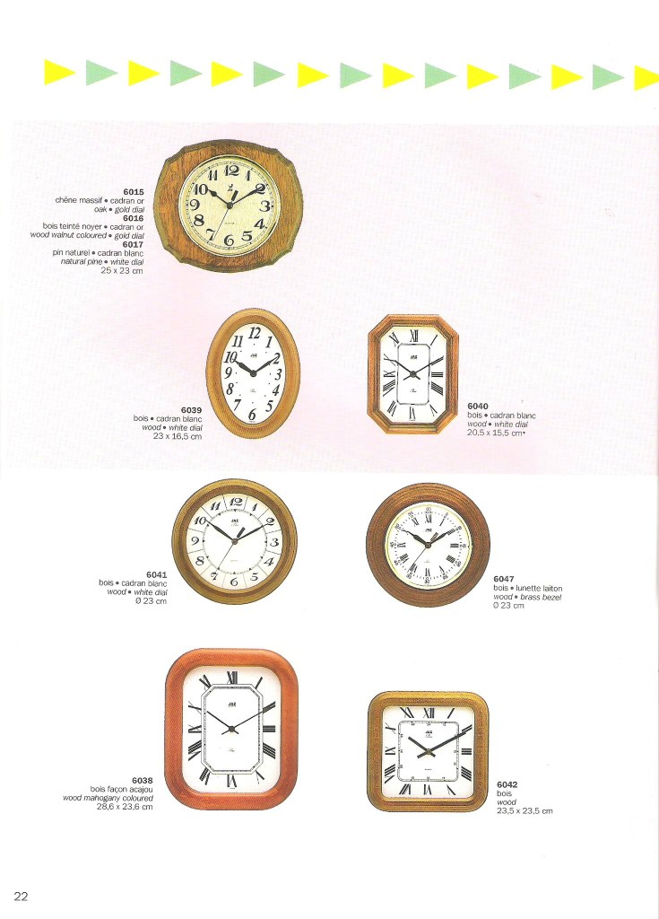 6040 , horloge murale , gamme Jaz Quartz , corps octogonale en bois , chiffres romains , aiguilles noires , mention France en bas de cadran , à pile LR6 , présente au catalogue 1985 page 22 et catalogue 86 page 26 uniquement , référencée n° 6040, petit modèle pour une horloge murale 20,5 x 15,5 cm