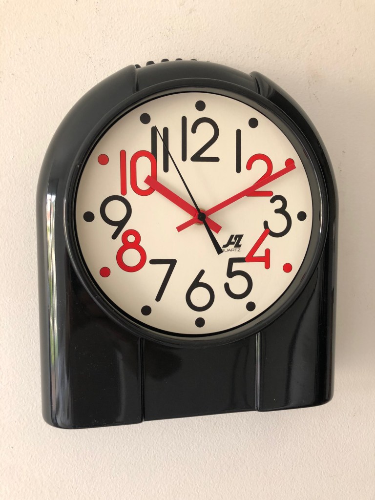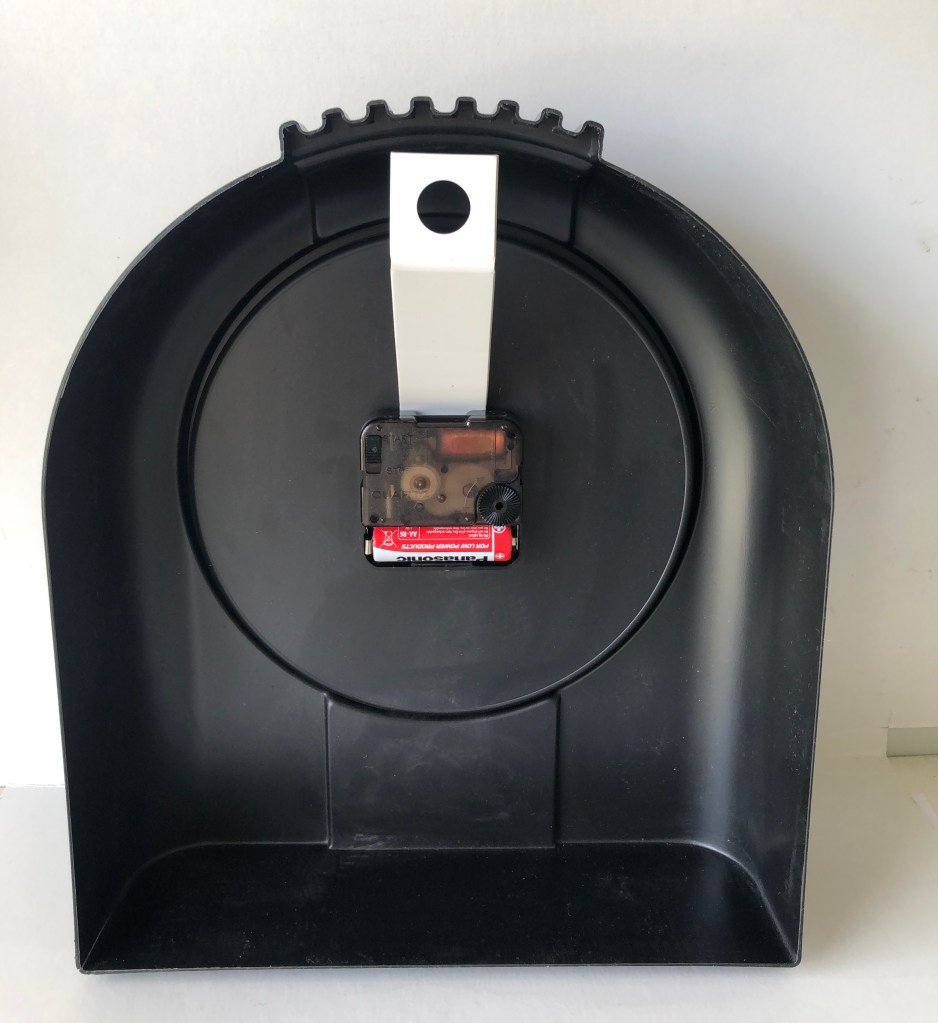 6361 , horloge murale , gamme Jaz Quartz , à pile LR6 , boîtier en plastique noir , aiguilles rouges , trotteuse centrale noire , format 28 x 24 cm .