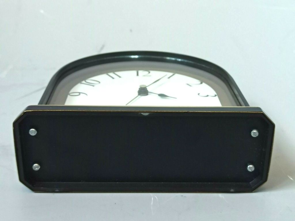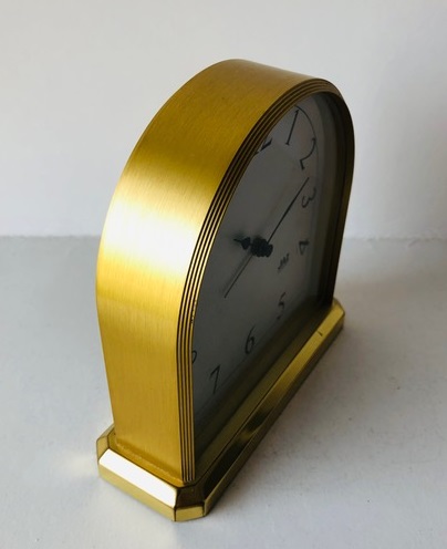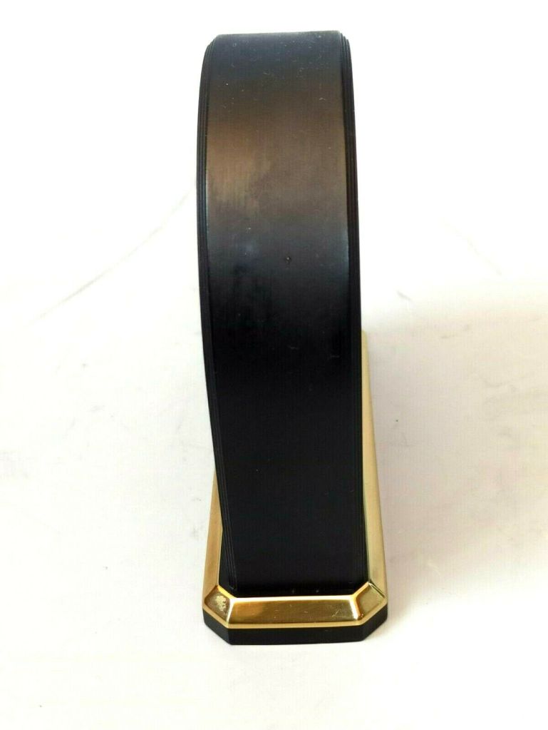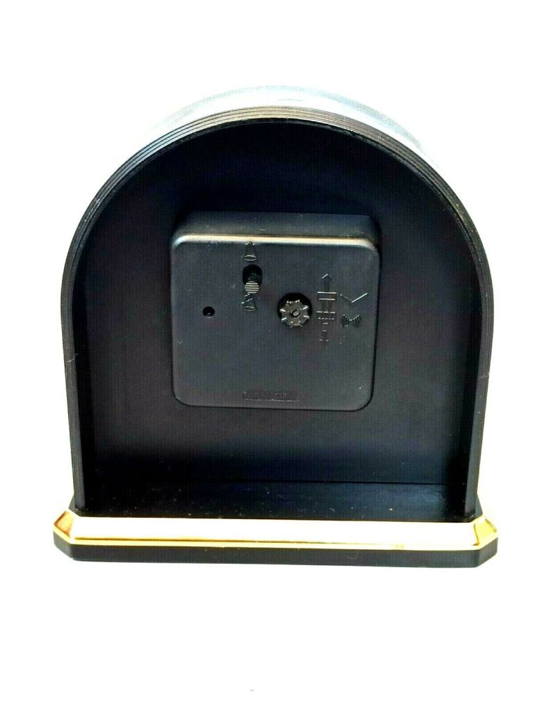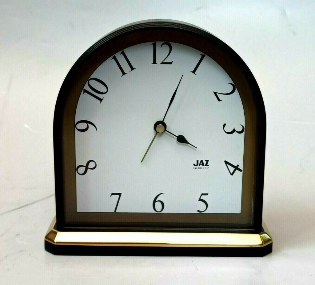 5073/5074 , réveil , forme borne , gamme Jaz Quartz , laiton noir , aiguilles poire et feuille noires , non-lumineux , numérotation tournante , format 12,5 x 13 cm ; Présent au catalogue 1988/1989 uniquement à la page 17. Références 5073 laiton doré ou 5074 laiton noirci et doré