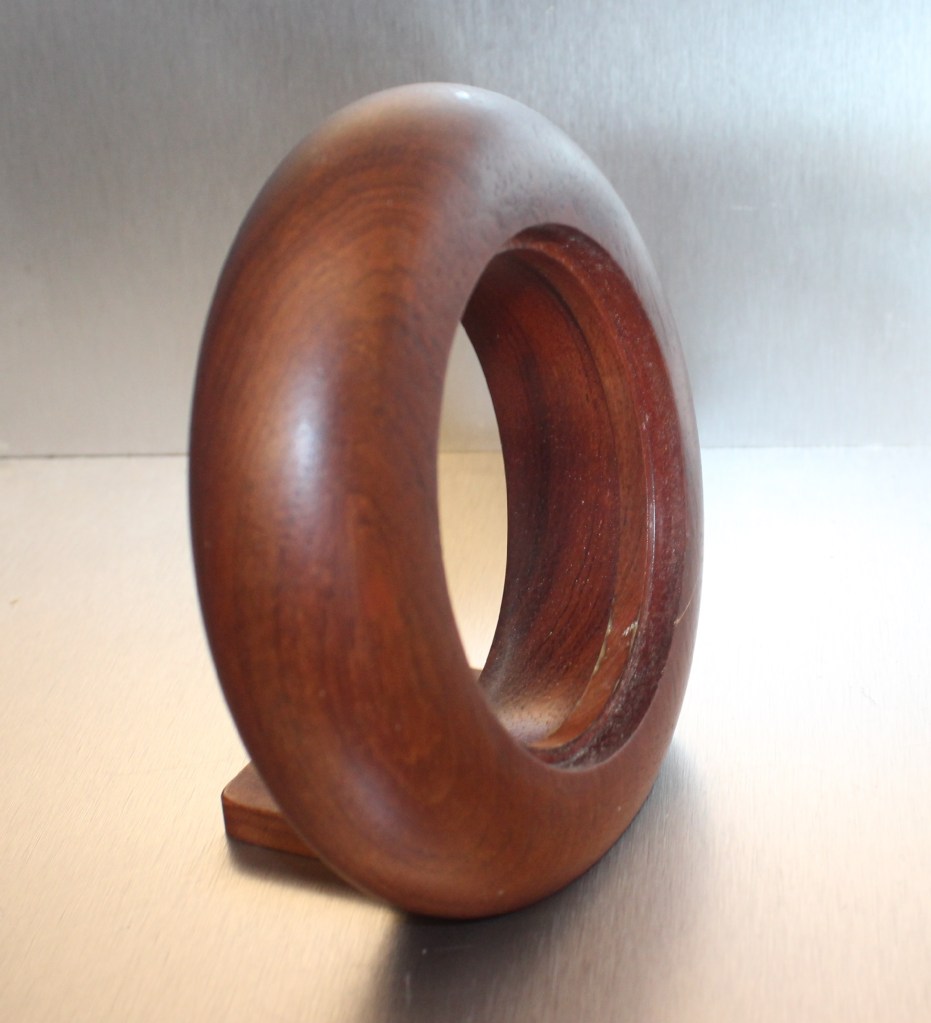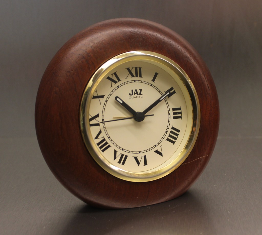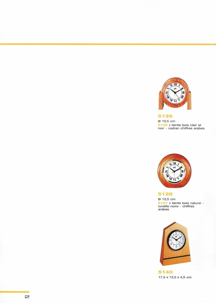 5128 , réveil bois Bubinga massif , gamme Jaz Quartz forme ronde , lunette dorée , chiffres romains , aiguilles noires en plastique , trotteuse centrale noire , chemin de fer à l’intérieur de la zone des chiffres , mouvement quartz Tochigi Tokei Japan à pile LR6 , hauteur 13,5 cm , poids 340 gr sans la pile . Présent aux catalogues 1991:1992 /1992/1993:1994 et 1994:1995 . Il faut tirer sur le bouton pour changer l’heure et l’enfoncer pour le réveil ; le bouton est juste clipsé il faut tirer fort pour l’enlever ; Existe en hêtre massif référencé 5127.