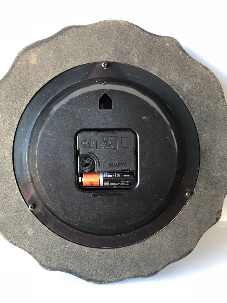 6096 , murale , bois compressé à décor floral , chiffres romains sur cadran blanc , aiguilles seringues noires , chemin de fer coupé d’un numérotation de 5 en 5 minutes jusqu’à 60, mouvement Baitu 9168 Made in China, quartz à pile LR6 , trotteuse centrale rouge , page 3 de la gamme des Jaz Les Actuelles du catalogue 1990 , diamètre 26 cm .