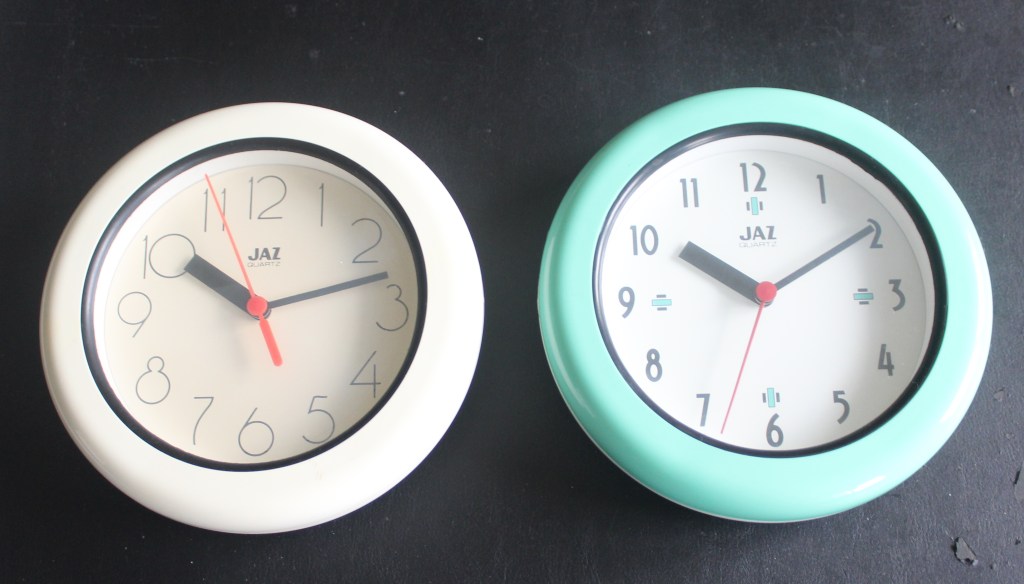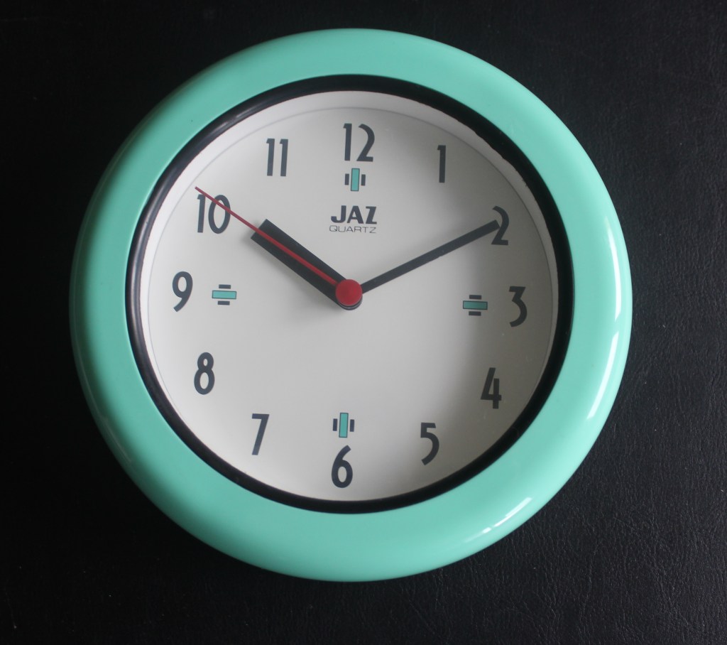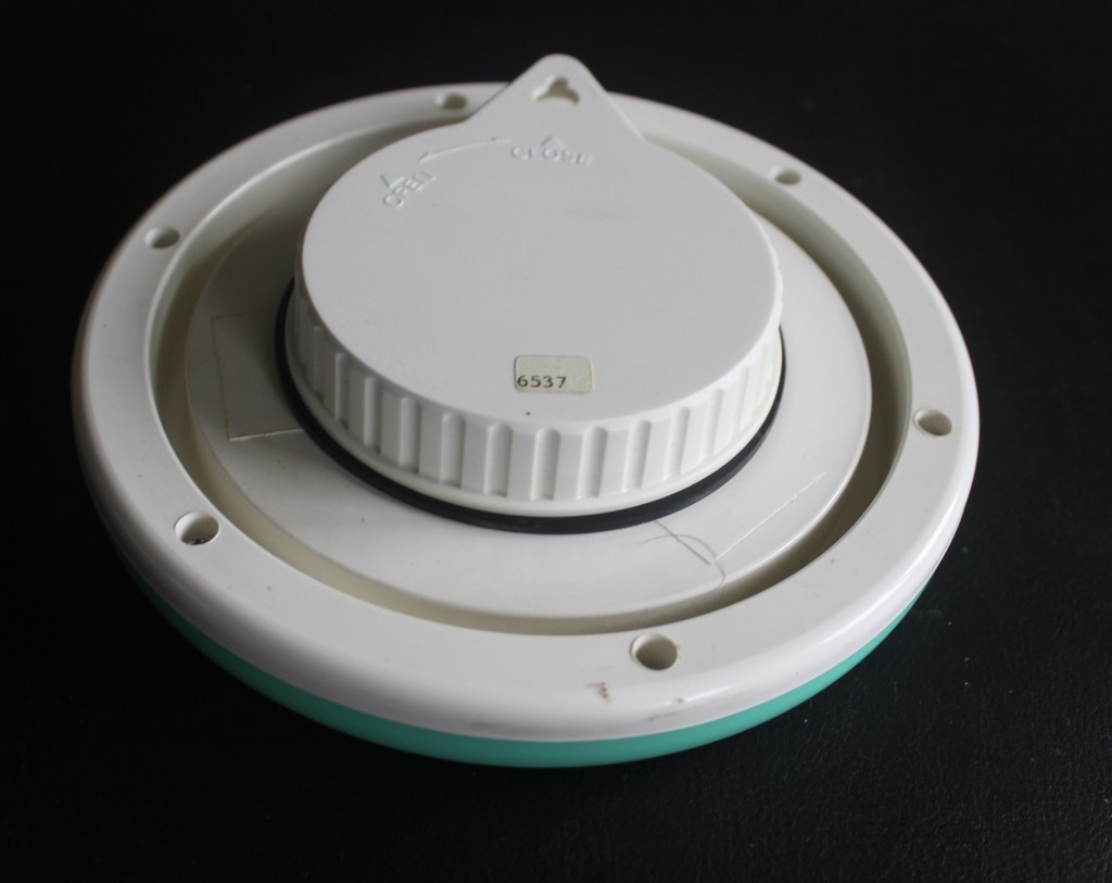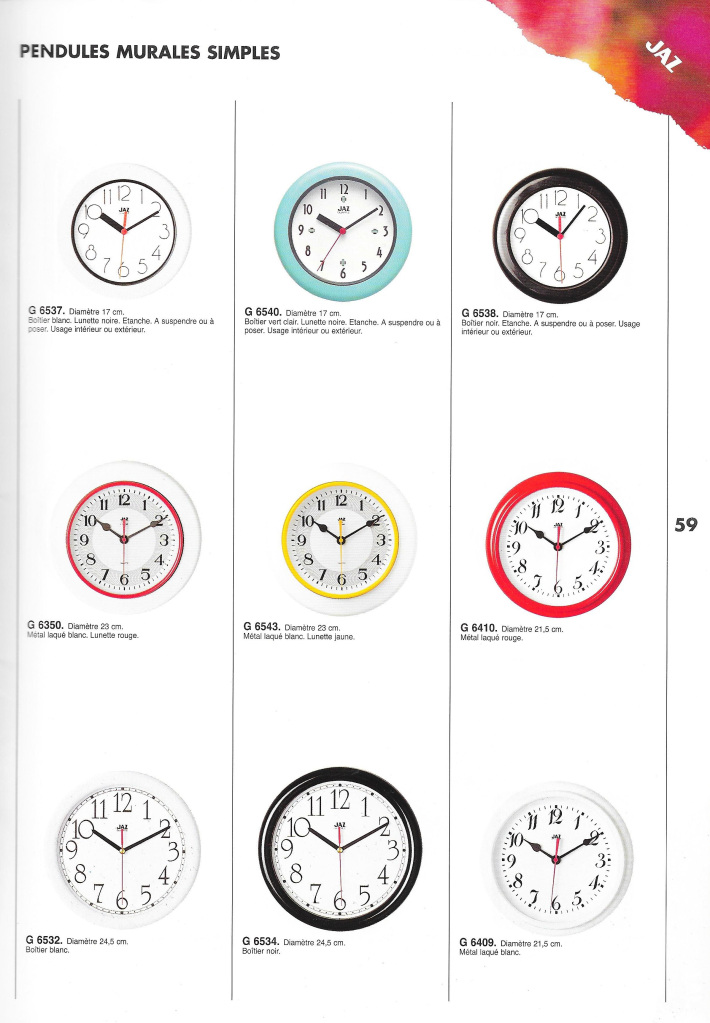6540 , petite horloge murale étanche , corps rond en plastique vert clair , aiguilles noires en plastique , lunette noire en caoutchouc assure l’étanchéité à l’avant autour de la vitre en verre plat , trotteuse centrale rouge sans talon , mouvement quartz Tochigi Tokei Japan à pile LR6 , disponible uniquement au catalogue 1994/1995 à la page 59 . Diamètre 17 cm , poids entre 315 et 320 gr . Sa particularité rare , qu’est l’étanchéité , permet de l’utiliser dans les pièces humides , comme les salles de bain ou à l’abri du soleil en extérieur .