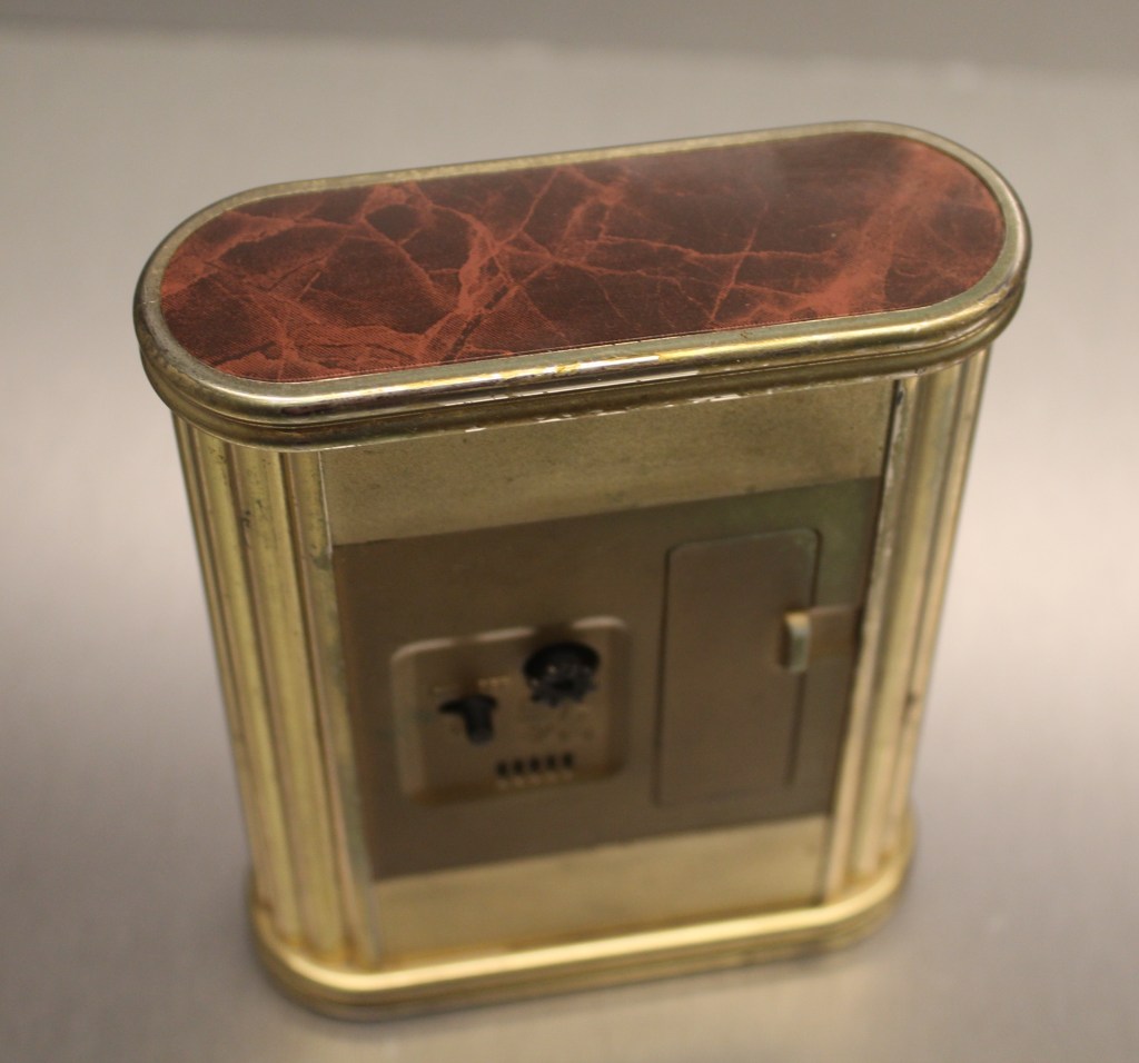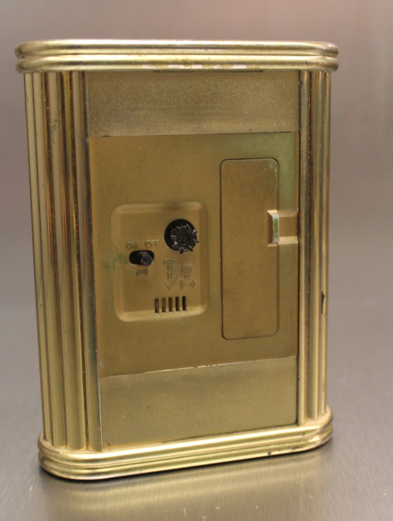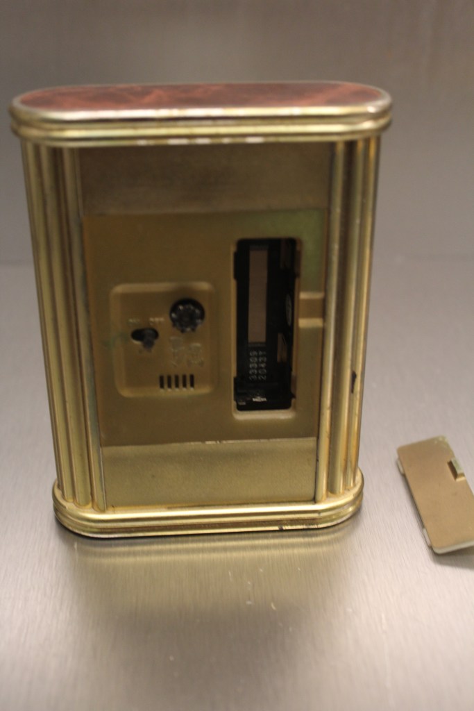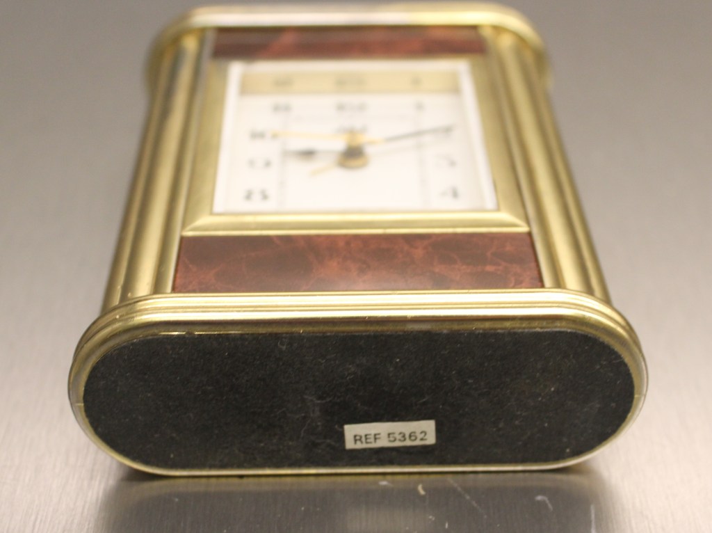 5362 , réveil , gamme Jaz Quartz , mouvement à pile LR6 , rectangulaire en plastique doré , avec inserts de laques brun marbré en plastique , chiffres Breguet , aiguilles noire poire et feuille , chemin de fer carré à l’intérieur de la zone des chiffres , vitre en plexiglas , format 12 x 9,5 x 3,5 cm , poids 370 gr . Existe en version noir réf. 5361. Nouveauté du catalogue 1992 et disponible jusqu’au catalogue 1994/1995 . Ces garnitures en plastique vieillissent mal dans le temps .