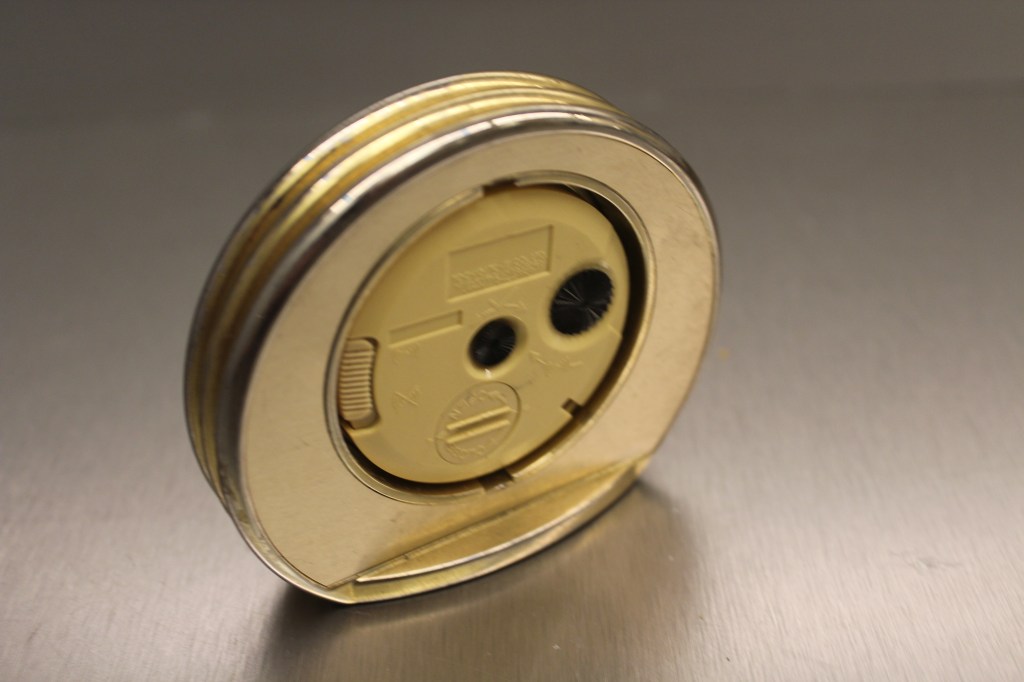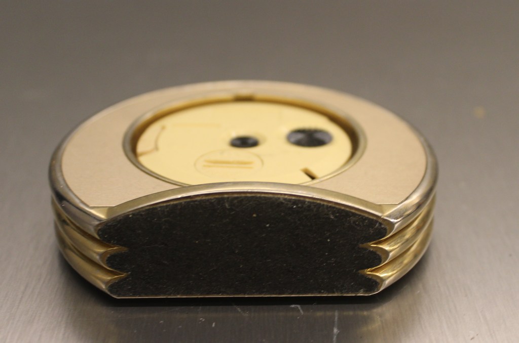 G5433 , petit réveil , Jaz Quartz , forme demi-lune , corps en laiton doré , trois rainures sur la tranche , mouvement quartz à pile bouton LR44 , calibre 27507 , chiffres Breguet , aiguilles dorées , aiguilles lumineuses , format 7,5 x 8,5 x 2,2 cm poids 260 gr. Présent uniquement au catalogue 1997/1998 à la page 7 .