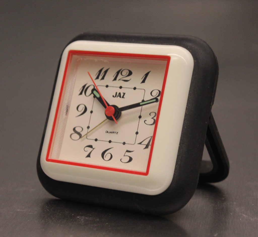 4335 , petit réveil , quartz sonnerie simple , chevalet , format 7,5 x 7,5 x 3 cm, plastique blanc à jonc noir au pourtour en caoutchouc , chiffres Breguet , aiguilles noires en plastique , aiguilles lumineuses , trotteuse rouge centrale , poids 85 gr sans la pile LR6 ; Présent aux catalogues 1987/1988 ; 1988/89 et 1990