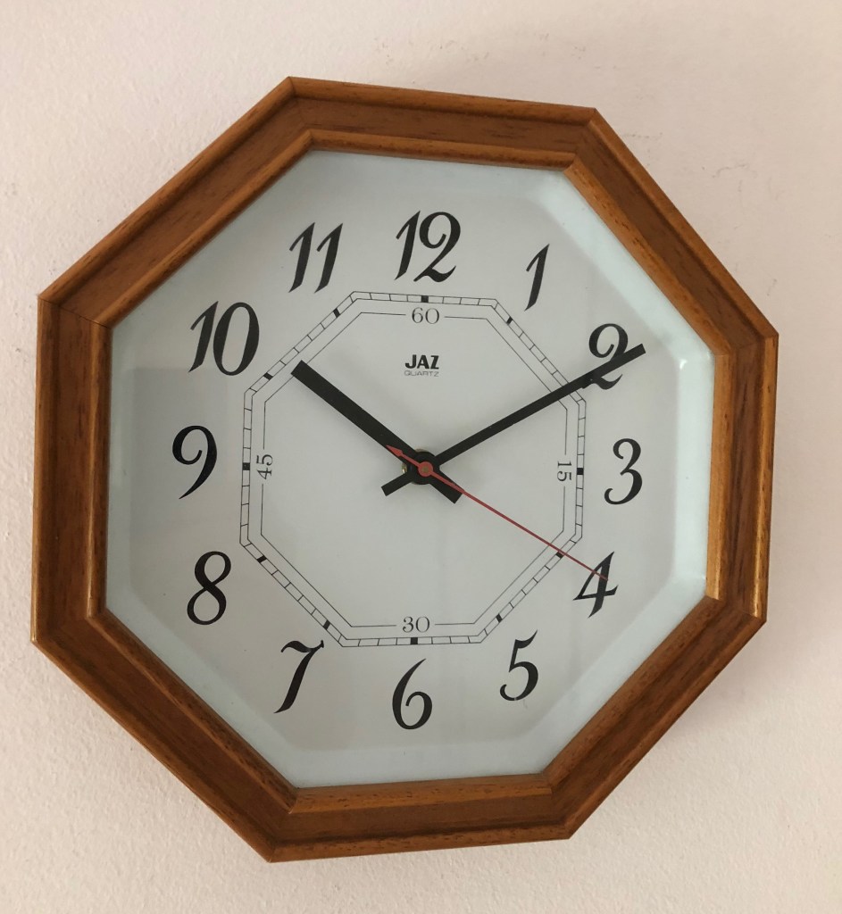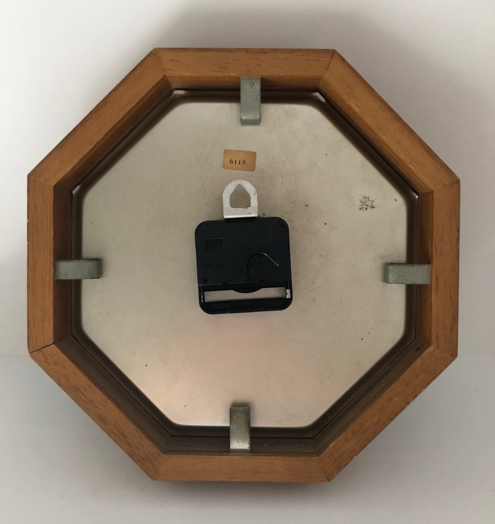6118 , horloge murale , gamme Jaz Quartz , corps octogonal en bois massif , mouvement quartz à pile LR6 , aiguilles bâtons noires , cadran métal émaillé blanc en cuvette , trotteuse centrale rouge , chiffres Breguet , chemin de fer octogonal à l’intérieur de la zone des chiffres numéroté jusqu’à 60 . Format 25,5 x 25,5 x 4 cm ; Nouveauté du catalogue 1992 à la page 3 et présente jusqu’au catalogue 1994/1995
