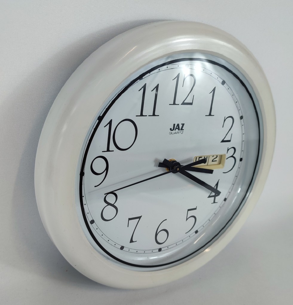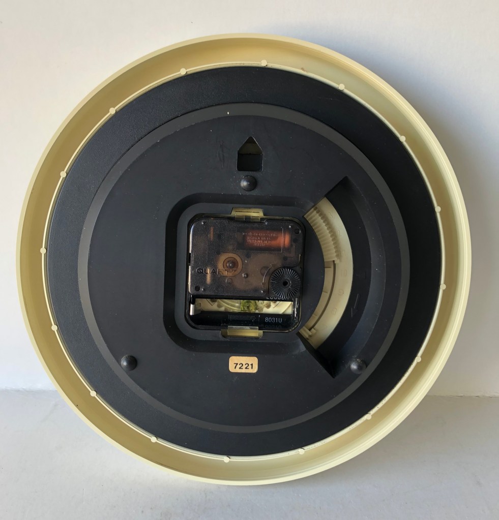 7221 horloge murale , catégorie Les Pratiques , corps en plastique rond , Jaz Quartz , à pile LR6 , à dateur jour et date , à trotteuse centrale ,chemin de fer stylisé, diamètre 23 cm ; disponible de 1990 à 1995 . existe en façon bois sous la référence 6417 sans dateur .