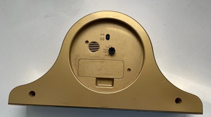 G5375 , réveil borne , corps en métal doré , quartz à pile LR6 , aiguilles poires noires non-lumineuses , trotteuse centrale dorée , chiffres romains , chemin de fer rond à numérotation cardinale au pourtour du cadran , format 11 x 20 x 4 cm .