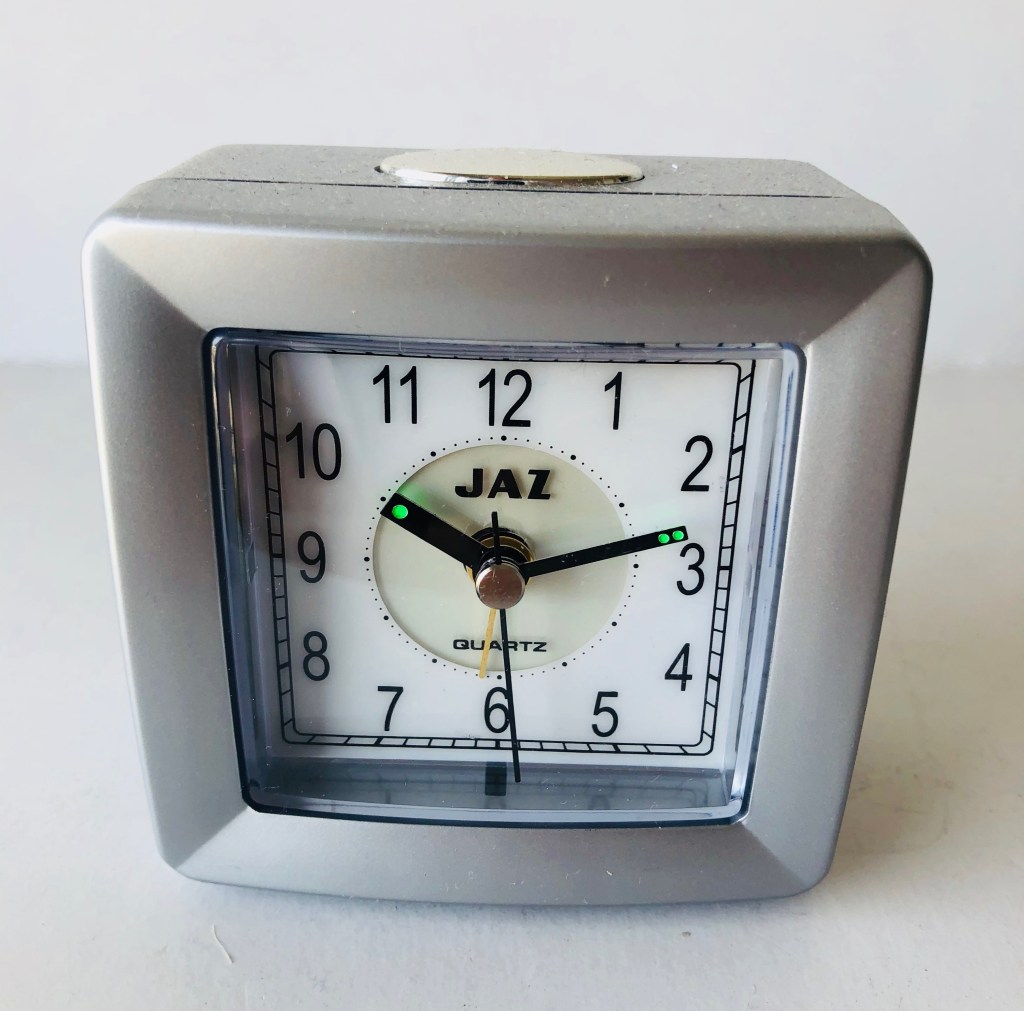 5476 , petit réveil carré , corps en plastique argenté , quartz à pile LR6 , aiguilles noires lumineuses , trotteuse centrale noire , chemin de fer carré au pourtour du cadran , arrêt de sonnerie au sommet