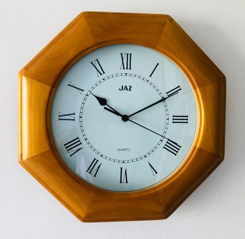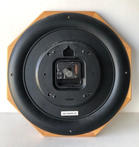 6959 horloge murale , quartz à pile LR6, corps octogonal en bois teinté chêne, chiffres romains, aiguilles noires poire et feuille, chemin de fer rond à l’intérieur de la zone des chiffres, trotteuse centrale, format 30 x 30 x 4,5 cm. Disponible uniquement en 2000.