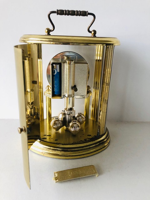 7843 pendule en laiton sous cage , à poser, style 400 jours, chiffres romains , aiguilles noires poire et feuille, quartz à pile LR6, bélière, made in Germany, disponible de 1988 à 1994 . Poids: 827 gr. Format 21 x 15 x 11,5 cm.
