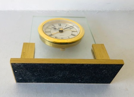 5278 , réveil , en laiton et verre, quartz à pile LR6, aiguilles poire et feuille noires , chiffres romains, trotteuse centrale dorée , non-lumineux , disponible uniquement au catalogue 1997/98 à la page 7. Format 10,2 x 10 x 13,6 cm; Poids: 304 gr.