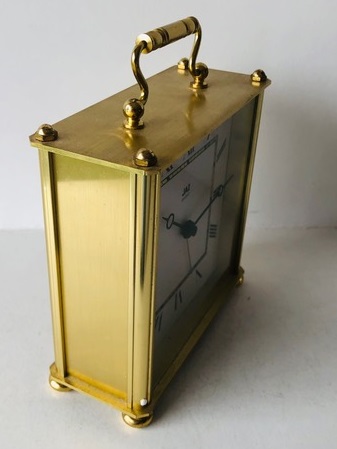 5371 réveil , gamme Jaz quartz , format 15 x 12 x 4,5 cm, quartz à pile LR6, aiguilles pontifes noires non-lumineux , corps rectangulaire en laiton avec bélière, chemin de fer doré à l’intérieur de la zone des chiffres romains, Nouveauté du catalogue 1992 disponible jusqu’en 1998