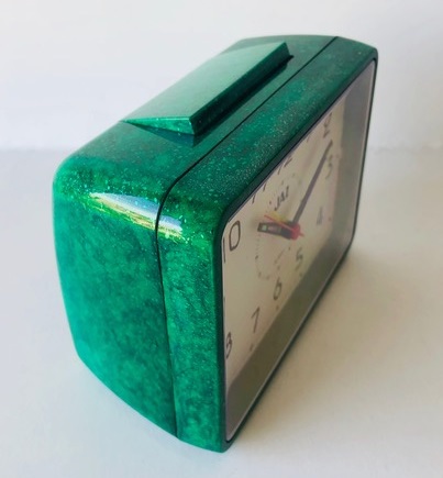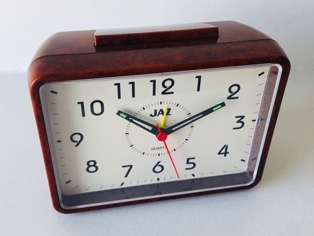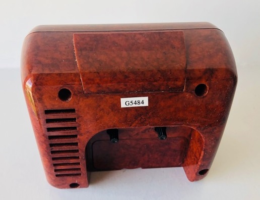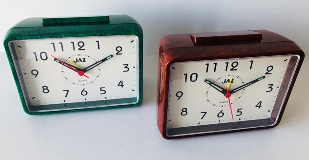 5484 / 5485 Réveil quartz à pile LR6, aiguilles lumineuses , trotteuse centrale rouge , arrêt de sonnerie au sommet coque en plastique de couleur brun/rouge marbré pour la réf: 5484 et de couleur vert marbré pour la réf: 5485. Dim: 11,7 x 9 x 6,3 cm. Poids: 166 gr . Année circa 1999