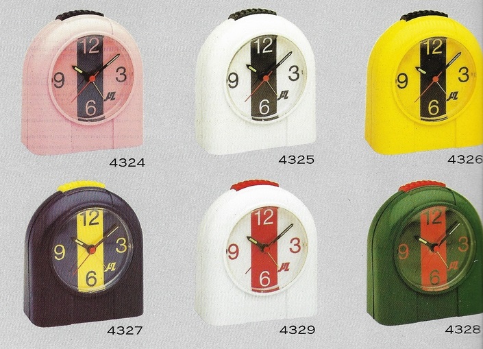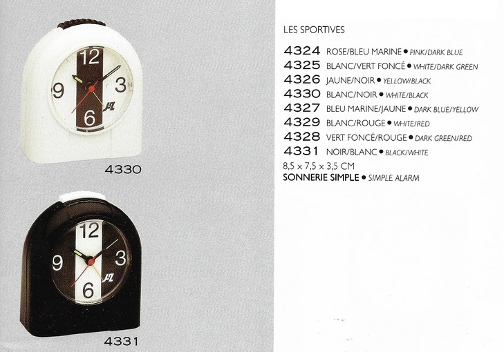 4324-4325-4326-4327-4328-4329-4330-4331 réveils bornes dites les Sportives ,corps en plastique, quartz à pile LR6, arrêt de sonnerie au sommet , trotteuse centrale , logo Jaz modernisé, quatre chiffres cardinaux , aiguilles noires lumineuses, format 8,5 x 7,5 x 3,5 cm, Poids: 140 gr , présents uniquement dans le catalogue 1987/88 page 6 et 7sous les références: 4324: rose/bleu marine, 4325: blanc/vert foncé, 4326: jaune/noir, 4327: bleu marine/jaune, 4328: vert foncé/rouge, 4329: blanc/rouge, 4330: blanc/noir, 4331: noir/blanc.