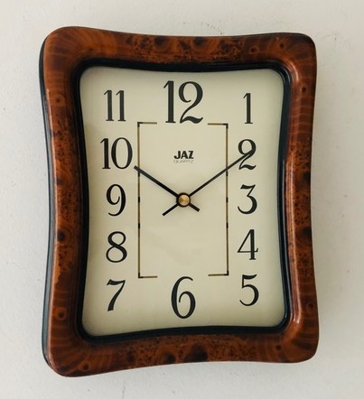 6083 horloge à quartz , disponible au catalogue 1988/89 page 25 uniquement, corps rectangulaire, gamme Jaz Quartz , en bois finition ronce de noyer, quartz à pile LR6 , aiguilles noires , sans trotteuse centrale, format 26 x 21,5 cm.