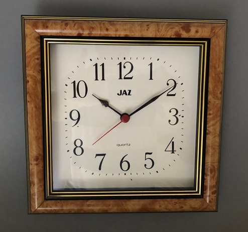 6902 Horloge carré , en bois véritable , aiguilles poire et feuille noires, trotteuse centrale rouge, à quartz à pile LR6, nouveauté du catalogue 1997/98 page: 31 disponible uniquement cette année là . Format 27 x 27 cm.