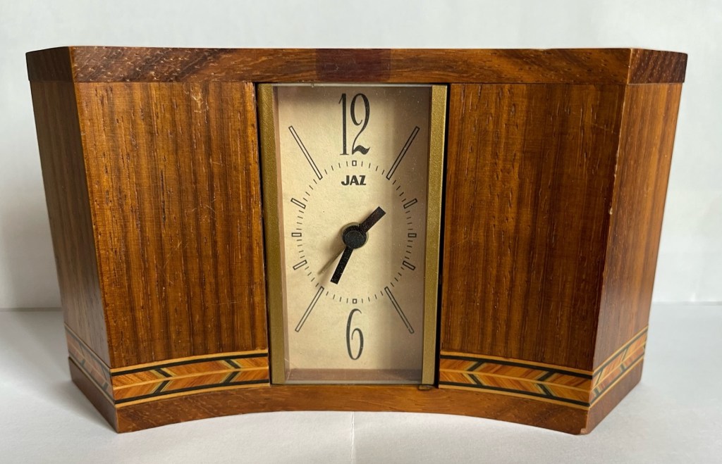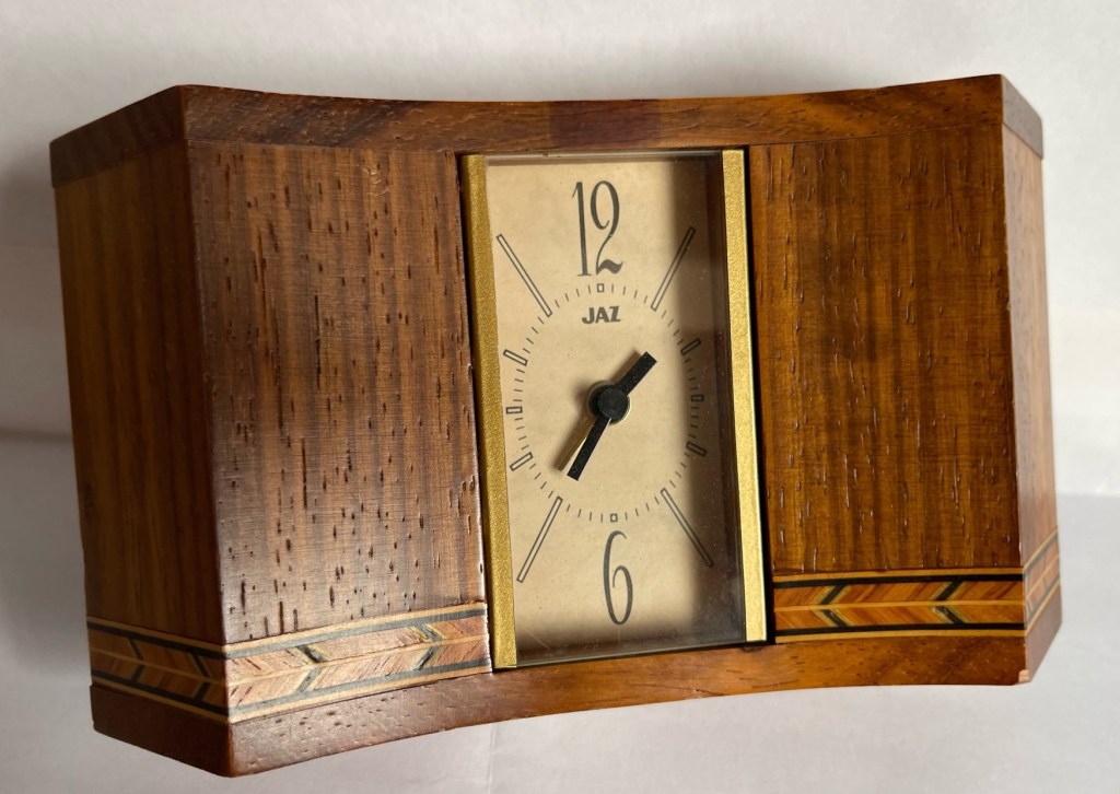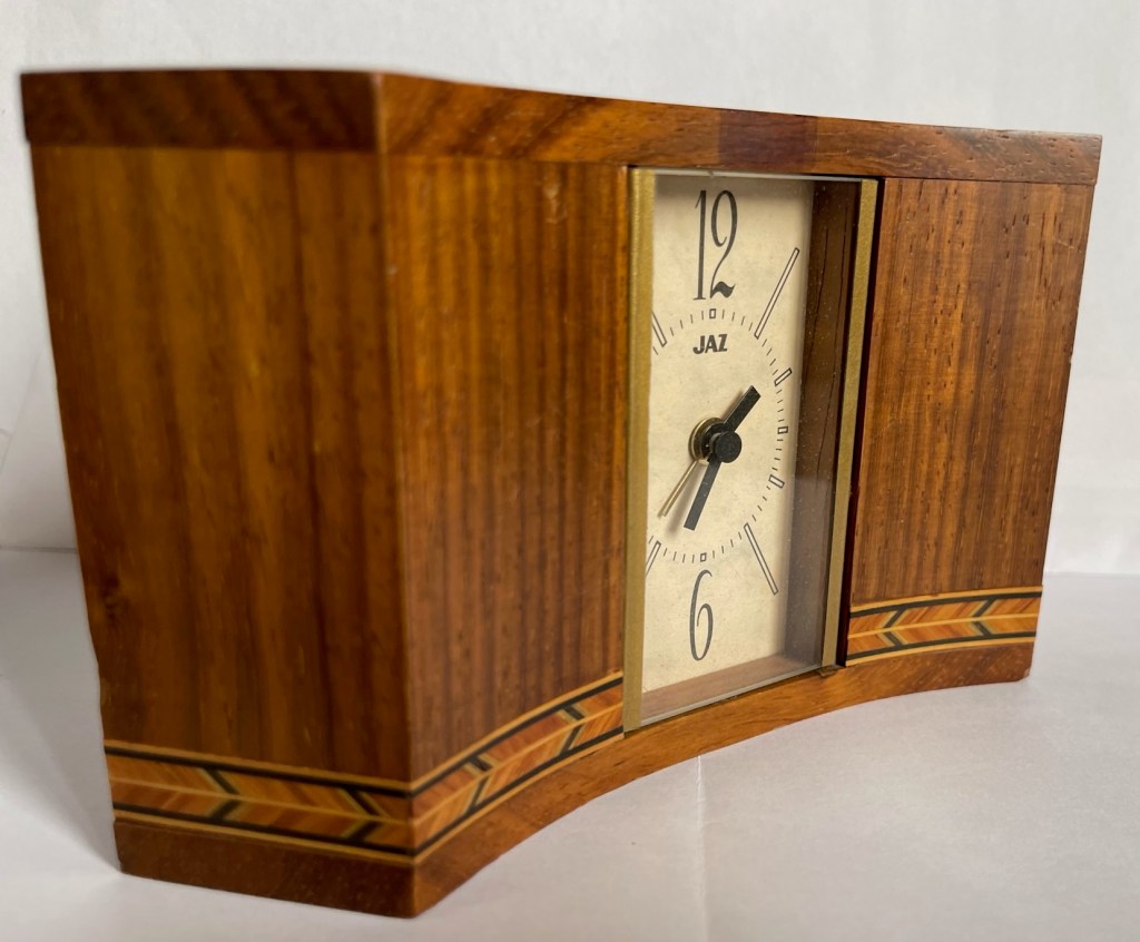 5135 grand réveil au corps concave en padouk massif (bois de santal) , décor filet de marqueterie fait main, à sonnerie par moduleur buzzer mouvement électrique , calibre par Tochigi Tokei Japan à quartz , pile LR6, aiguilles bâtons noires non-lumineuses, cadran rectangulaire champagne , deux grands chiffres et dix index, présent uniquement aux catalogues Jaz /Seiko/Lorus de 1992 à 1993/1994 page 33. Format 9 x 16,5 x 4,5 cm