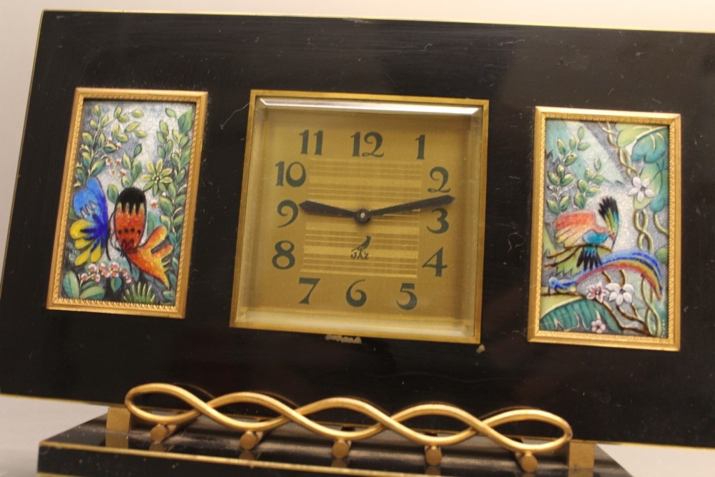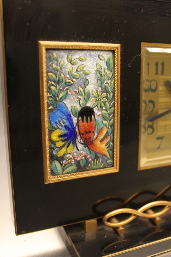 EMIC décor papillon et oiseau réf . 886-10 EMIC , grande pendule à poser , gamme à Tirage Limité , mouvement mécanique , calibre KL , sans fonction réveil , autonomie 8 jours , échappement à ancre , 11 pierres . Nouveauté du tarif de Nov. 1948 . Boîtier en métal laqué noir à filets dorés , garnitures et cadrans dorés , intermédiaire de socle doré en forme de torsade , cadran doré guilloché , émaux véritables incrustés à l’origine de son nom d’EMIC , vitre en verre biseauté , aiguilles glaives noires , non-umineux . Format 24,5 x 16 cm , poids 1,480 kg .