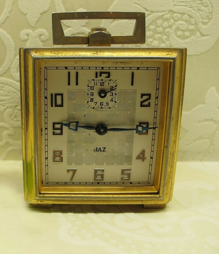 BUREAU , grand réveil-pendulette borne , mouvement mécanique , calibre B , daté 1928 sur le marteau . Largeur 28 cm , hauteur 16 cm , poids 1,270 kg . Corps en acajou , façade en marqueterie de bois exotiques sur fond de loupe d’orme . S’agissant d’un travail fait main avec des matériaux naturels , aucun Jaz Bureau n’est tout à fait identique . Document publicitaire , circa 1928 . On remarquera les aiguilles dorées différentes de nos modèles à aiguilles noires sans doute postérieures .Existait en version lumineuse ou non-lumineuse . Avec ses formes arrondies et son décor floral , le style choisi est encore plus proche de l’Art Nouveau que de l’Art Déco naissant .Vue de dos : le couvercle arrière présente trois ouvertures ouvragées , obturées par un fin tissu , permettant au son de la sonnerie de sortir du corps en bois .L’arrêt de sonnerie est au sommet .Ce couvercle arrière dissimule une cloche chromée très semblable à celle des réveils courants . Le calibre , à gauche , est protégé par une plaque qui présente le double avantage d’arrêter la poussière et contenir le bruit du mécanisme . Du fait de l’épaisseur du corps en bois et de l’emploi d’un cache arrière , les clés sont spécifiquement longues .Le cadran est émaillé , particularité rare chez Jaz . A droite du calibre B émerge le marteau de la sonnerie , sur lequel la date de production est poinçonnée en creux .