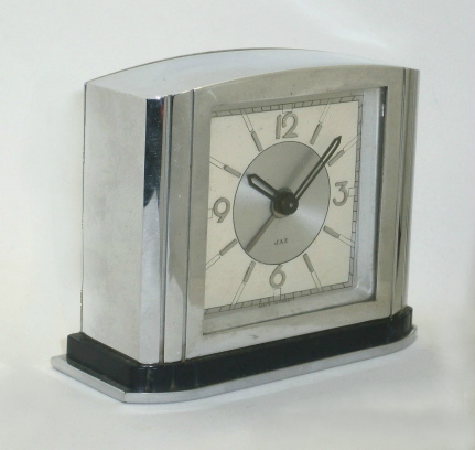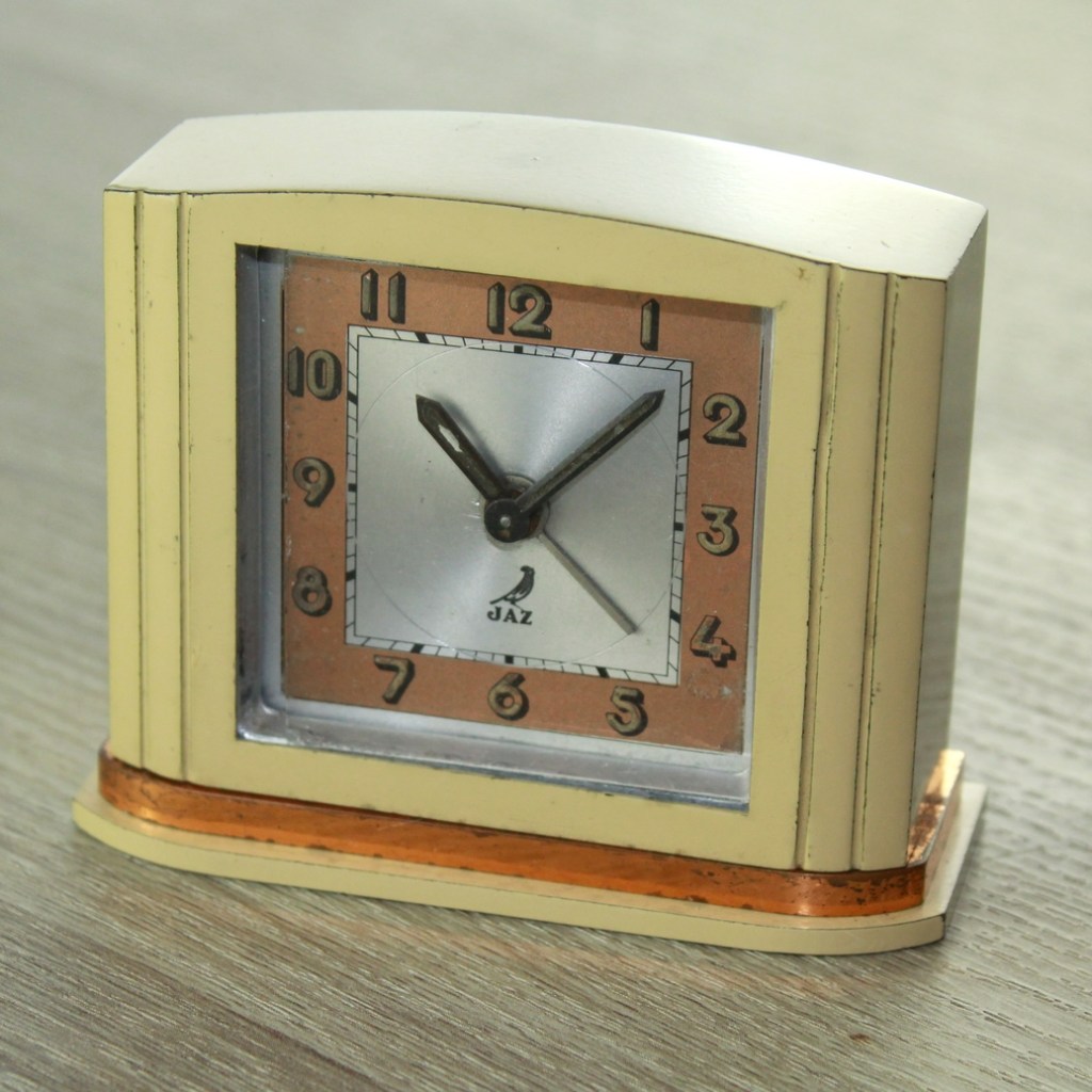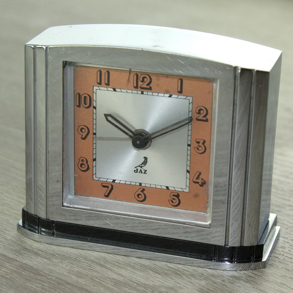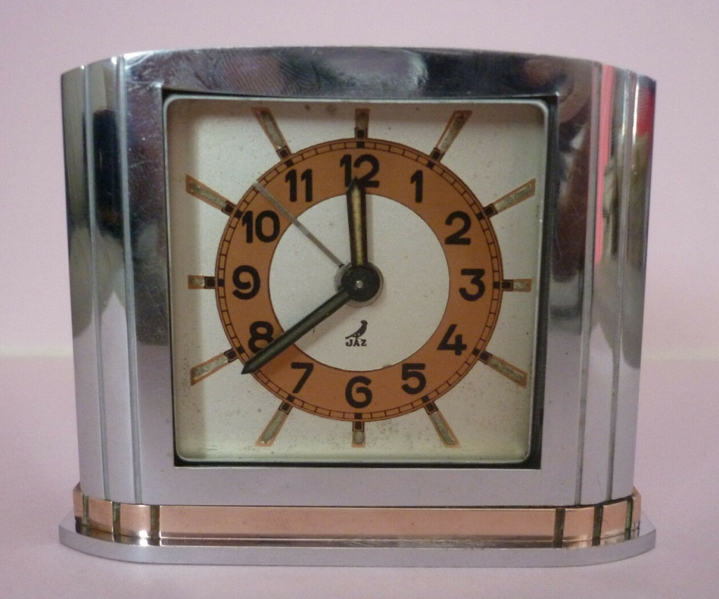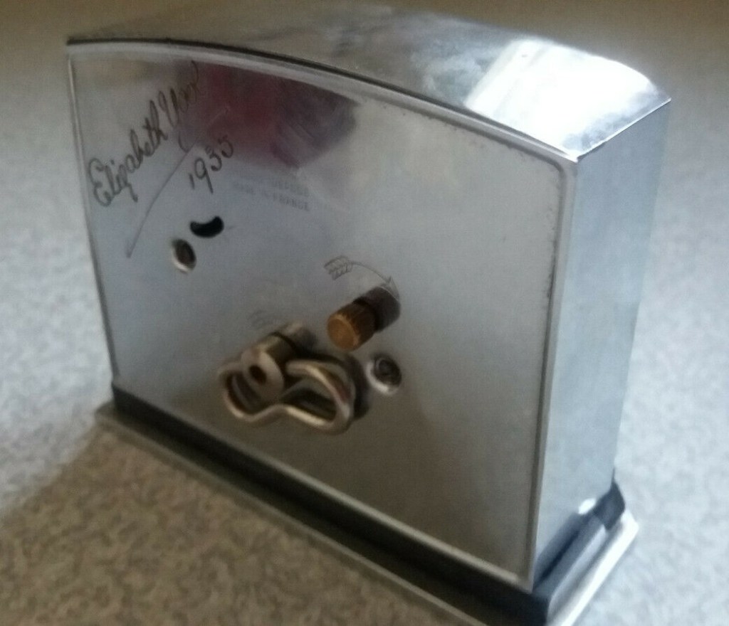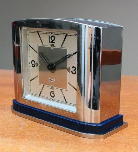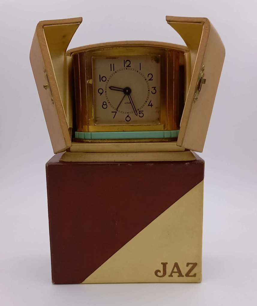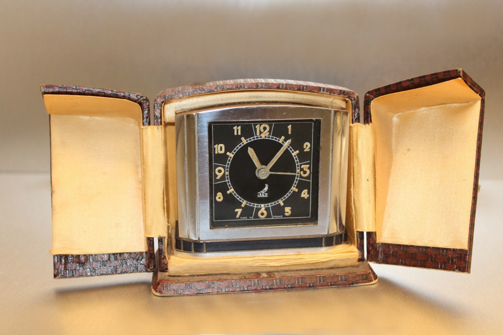 Vu sur le marché anglais , cette étonnante version non référencée sur les catalogues français, avec un dos spécifique qui s’explique par l’absence de fonction réveil , donc nul besoin d’orifices pour la clef ou le bouton du réveil . Au cadran , l’absence logique d’aiguille de réveil et la mention 8 jours , nous oriente vers une pendulette dotée du calibre K . La dédicace nous permet , sans véritable surprise d’ailleurs , une datation à 1935 quand la distribution du Jolic ne commence en France qu’à partir de 1936 puisqu’on sait que Jaz testait ces produits à l’étranger , en Belgique souvent après guerre , en Italie plus tardivement et en Grande Bretagne avant guerre .Publicité , pleine page 30 x 22 sur papier glacé , revuePlaisir de France1937