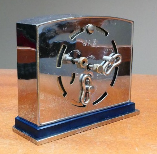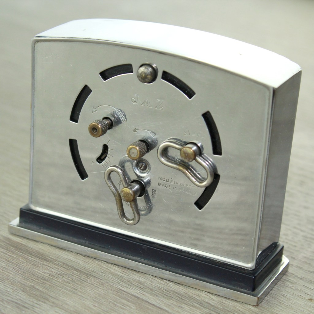 ARGIC , réveil , gamme des Stylites , mouvement mécanique , calibre J . Boîtier et socle en métal chromé , chevalet inclinable , colonnes en matière plastique de couleur , cadran métal teinté champagne , aiguilles glaives , non-lumineux , réf.431-10 , chemin de fer rectangulaire à l’extérieur de la zone des heures , mention Made in France en bas de cadran . Format 80 x 130 mm , poids 410 gr . L’ARGIC est présent au catalogue 1942 mais uniquement en version non lumineuse , il ne l’est plus du tout en 1943 . Cette version à cadran bleu est la propriété de notre ami , le collectionneur Serge Benatti ARGIC version n-l à chiffres romains Ces versions à colonnes bleues , non-lumineuses et sans jaseur boréal au dessus du logo , attestent de l’existence de l’ARGIC dès avant 1941/42 . Modèle à cheval sur deux périodes de la chronologie des logos Jaz , on peut le trouver avec les deux types d’estampille au cadran , avec ou sans jaseur .ARGIC chiffres romains, dos .