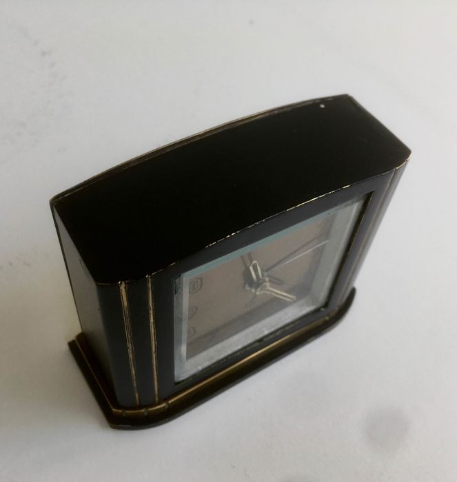 PARVIC , petit réveil , gamme des Stylites , mouvement mécanique , calibre 1J . Nouveauté du tarif de Déc. 1947 . Boîtier en Jazolite avec filets jaunes , cadran métal verni doré , livré en écrin, disponible en non-lumineux ou avec aiguilles et points lumineux . Format 8,5 x 7,5 cm, poids 225 gr . Deux couleurs disponibles : jazolite noire réf.0406-11 et jazolite brun foncé réf.0406-21 . Il pouvait être fourni un écrin chapelle en option .