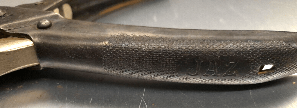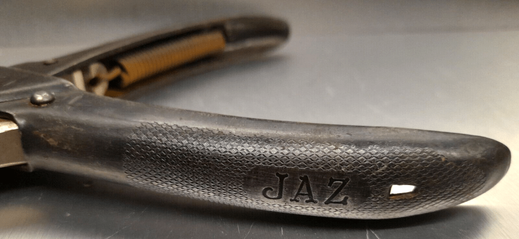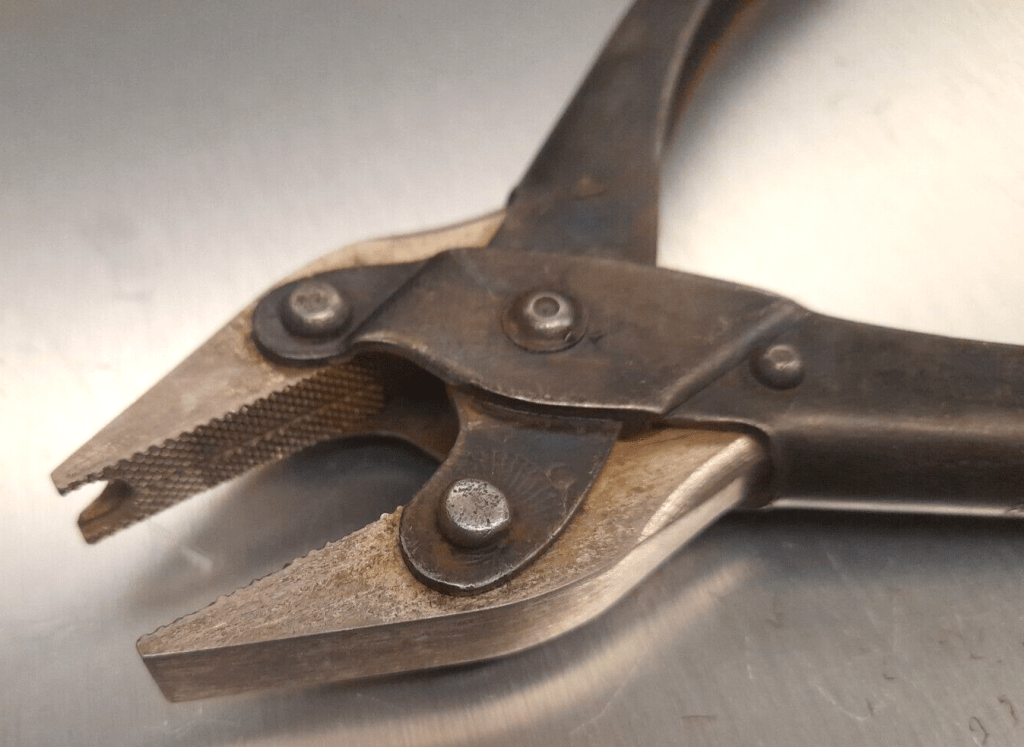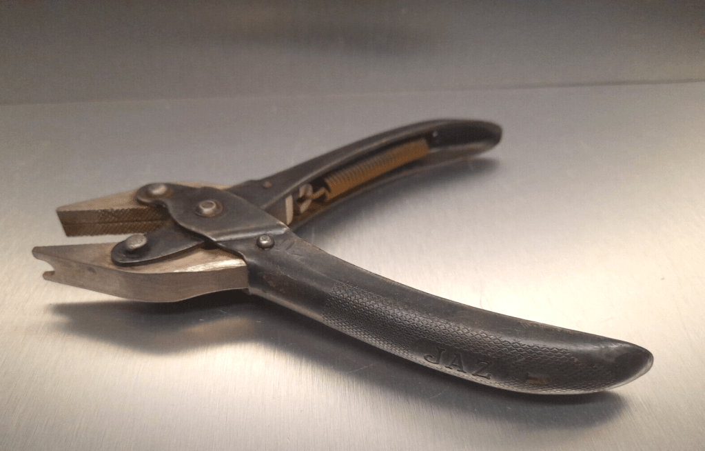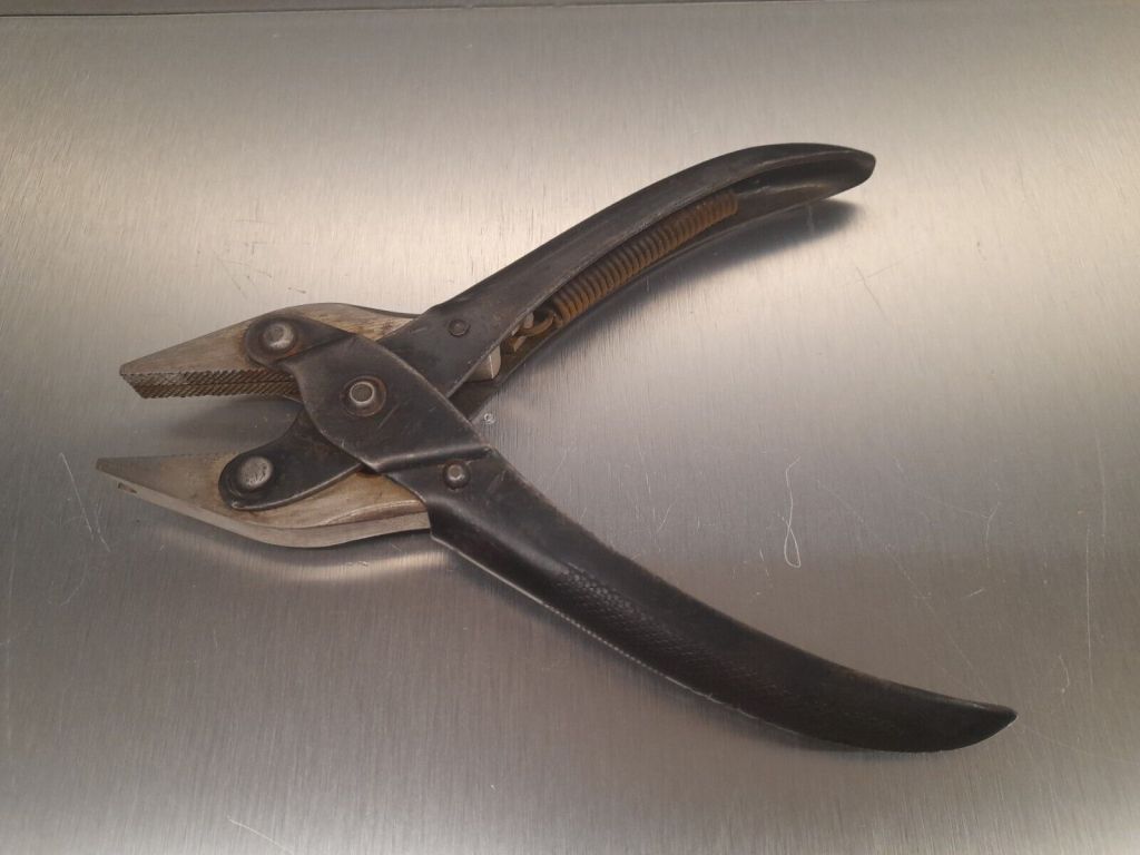 Pince à crapaudine , outil spécifique Jaz . Cette pince à mors parallèles a été spécialement conçue pour extraire de la platine arrière du calibre U la crapaudine chassée usagée et pour chasser à nouveau une crapaudine neuve . Poids 230 gr , longueur fermée 16,5 cm.