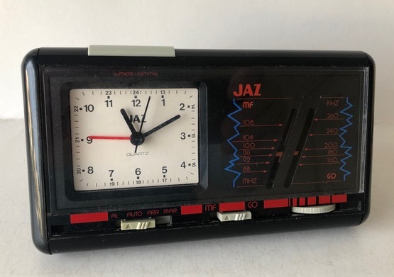 5341 / 5342 Réveil borne de la gamme Jaz Prestige et Jaz Quartz , trotteuse centrale , aiguilles cathédrales , nouveauté du catalogue 1991/92 page: 3 , disponible jusqu’en 1994. corps en bakélite teinte bordeaux marbré pour la réf: 5341 et Bakélite teinte verte pour la réf: 5342 Format 13,5 x 14 x 6,5 cm, poids: 353 gr. Pile: LR6
