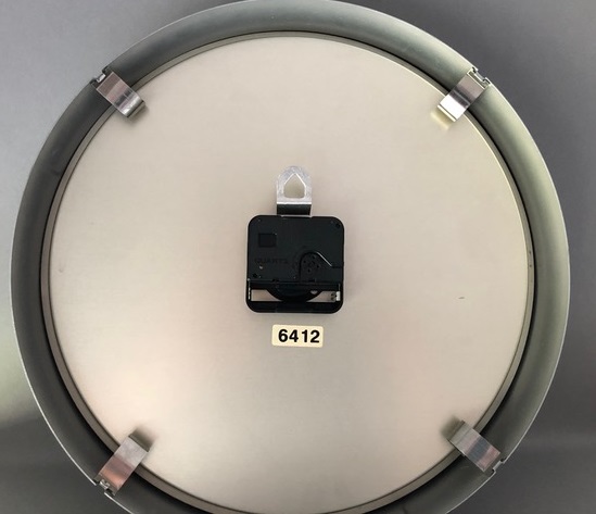 6412 Horloge en métal de la gamme de Jaz à Quartz, trotteuse centrale noire, nouveauté du catalogue 1990 dans « Les Pratiques », disponible jusqu’en 1992. Diamètre 30,8 cm . Existe en version calendrier référencée 7201