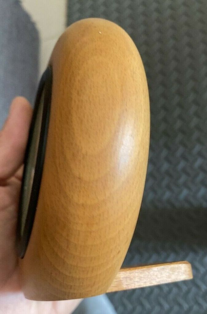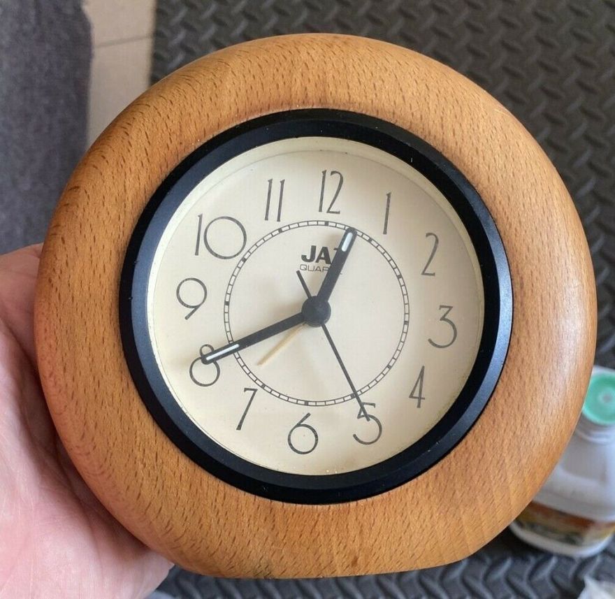 5127 , réveil en hêtre massif , gamme Jaz Quartz forme ronde , lunette métal noir , chiffres arabes , aiguilles noires en plastique , aiguilles lumineuses , trotteuse centrale noire , chemin de fer à l’intérieur de la zone des chiffres , mouvement quartz Tochigi Tokei Japan à pile LR6 , hauteur 13,5 cm , poids 340 gr sans la pile . Présent aux catalogues 1991:1992 /1992/1993:1994 et 1994:1995 . Il faut tirer sur le bouton pour changer l’heure et l’enfoncer pour le réveil ; le bouton est juste clipsé il faut tirer fort pour l’enlever ; Existe en Bubinga massif référencé 5128.