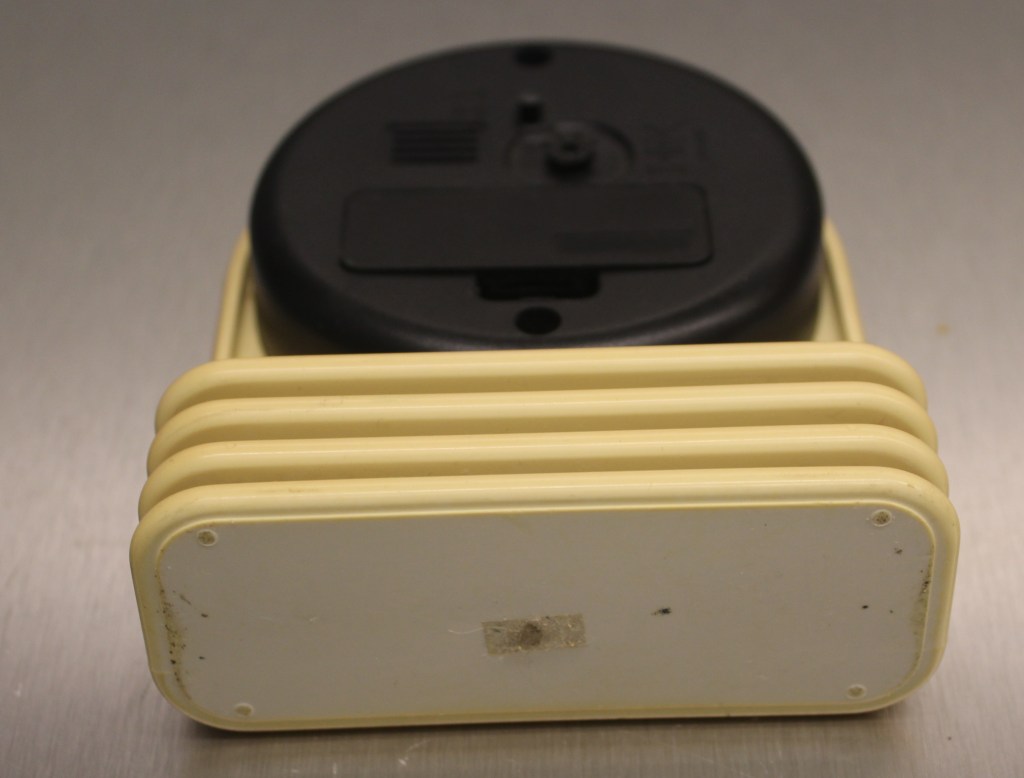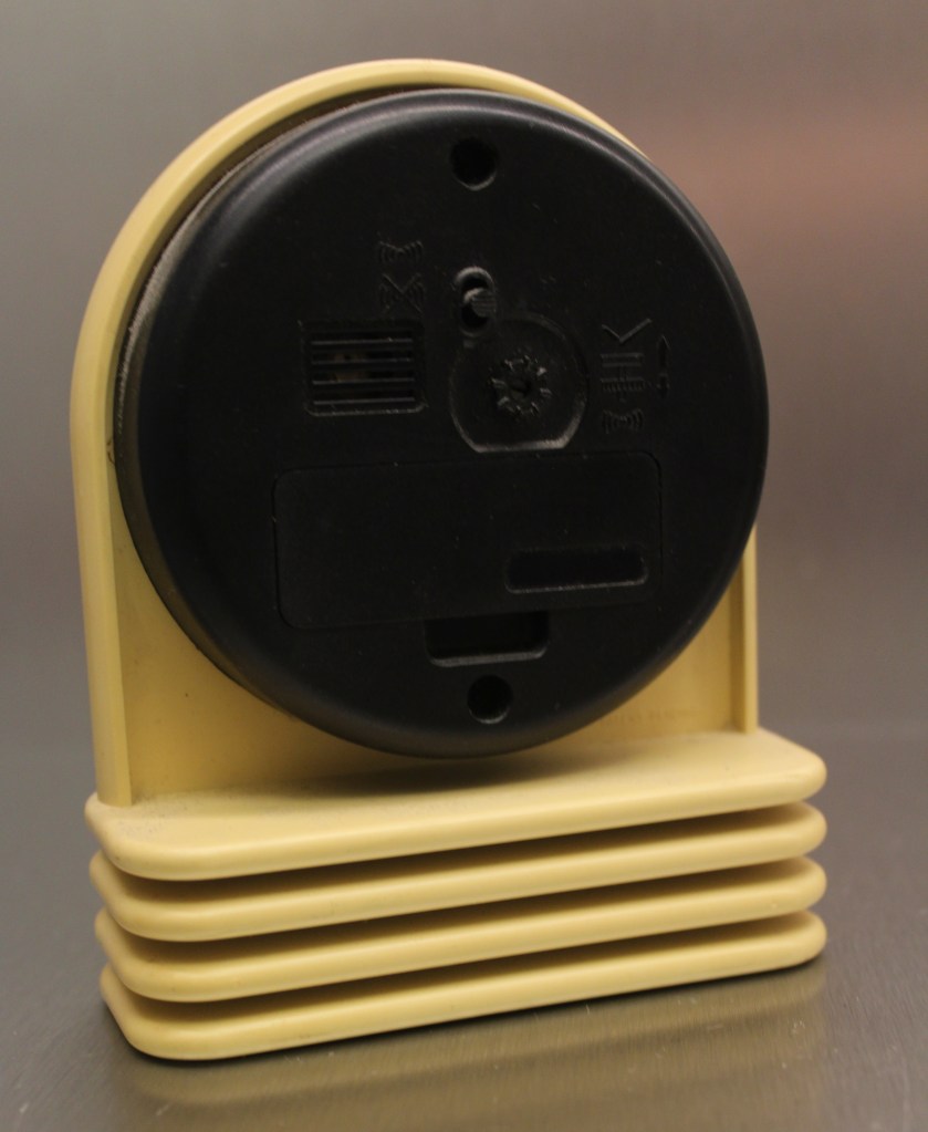 4472 , réveil de forme borne , Jaz Quartz , mouvement quartz à pile LR6 , corps en plastique blanc ( notre exemplaire a beaucoup jauni ) , chemin de fer allégé au pourtour du cadran numéroté jusqu’à 60 , trotteuse centrale noire , aiguilles et chiffres lumineux , format 12 x 9,9 x 4 , poids 190 gr sans la pile , nouveauté du catalogue 1991/192 , disponible jusqu’au catalogue où sa référence devient G4472 ; existe en noir réf. 4473